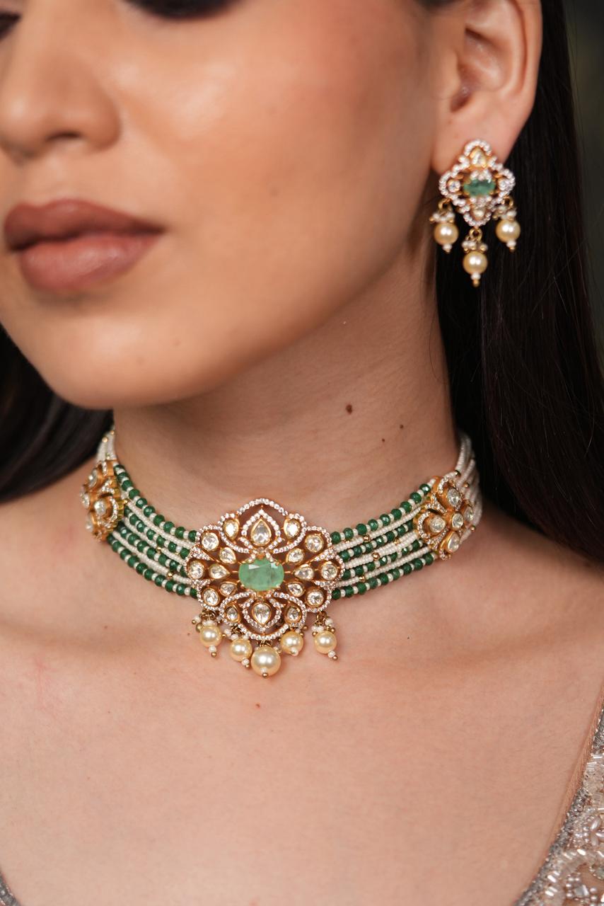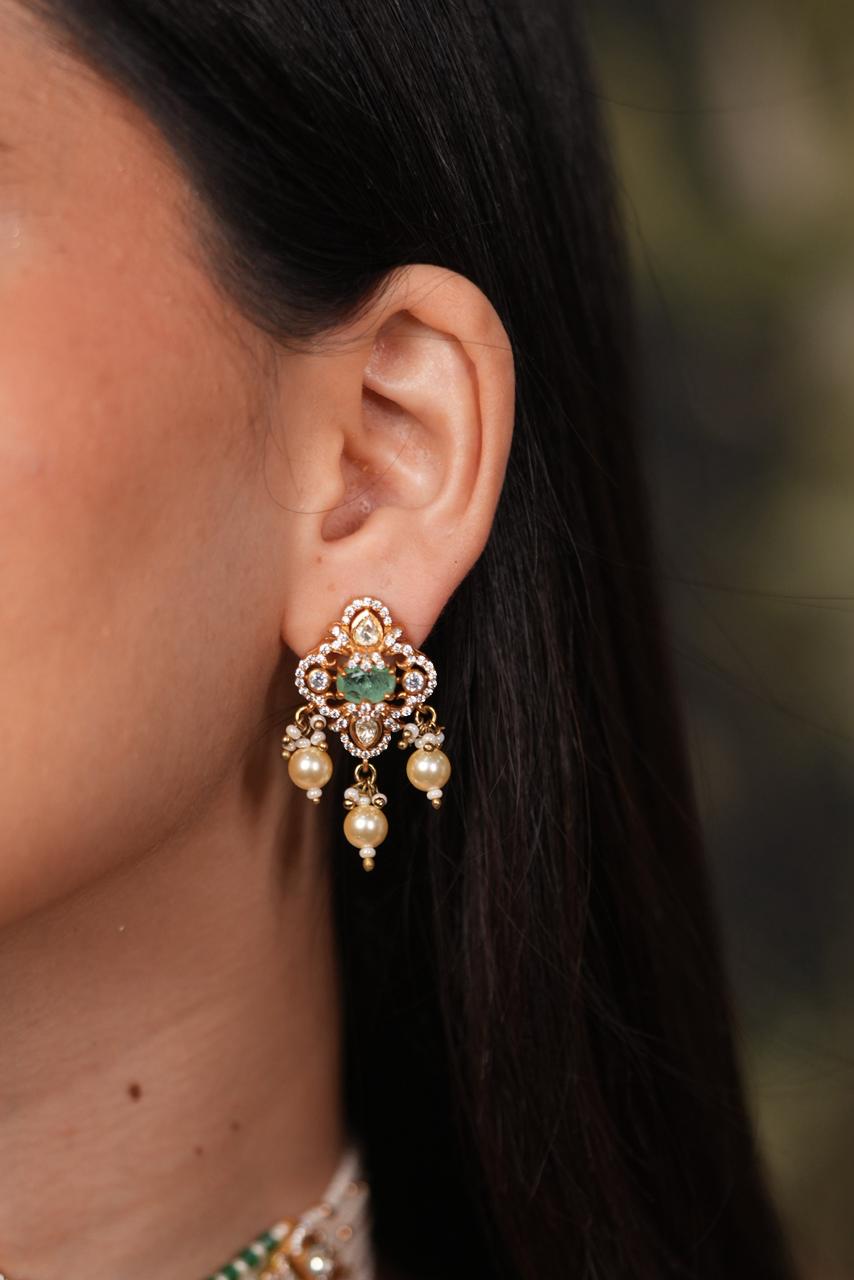A Russian emerald in the center with Polki Moissanite detailing around leading to strings of pearls and emeralds that meet Polki floral motifs on the sides again and pearls below that complete the whole look. It comes with small but statement making stud like earrings.