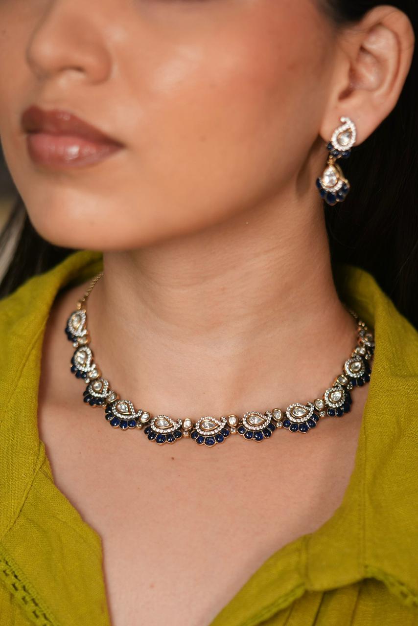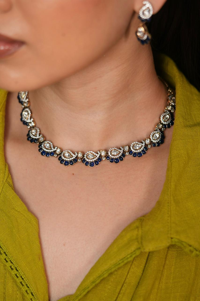 Featuring dazzling Moissanite Polki stones set in a rich gold base, this choker-style necklace is accented with deep navy blue enamel detailing that adds a vibrant contrast and a royal finish.
