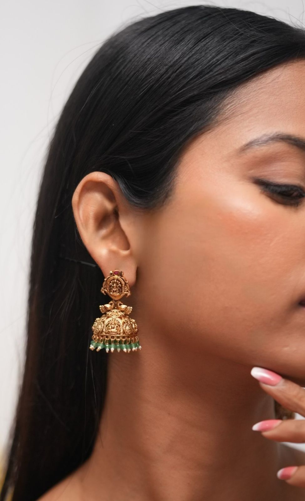 Adorned with intricate motifs and a divine Lakshmi engraving, these mid-sized gold jhumkas blend timeless charm with a hint of goddess magic. Perfect for when you want to shine — subtly yet splendidly.