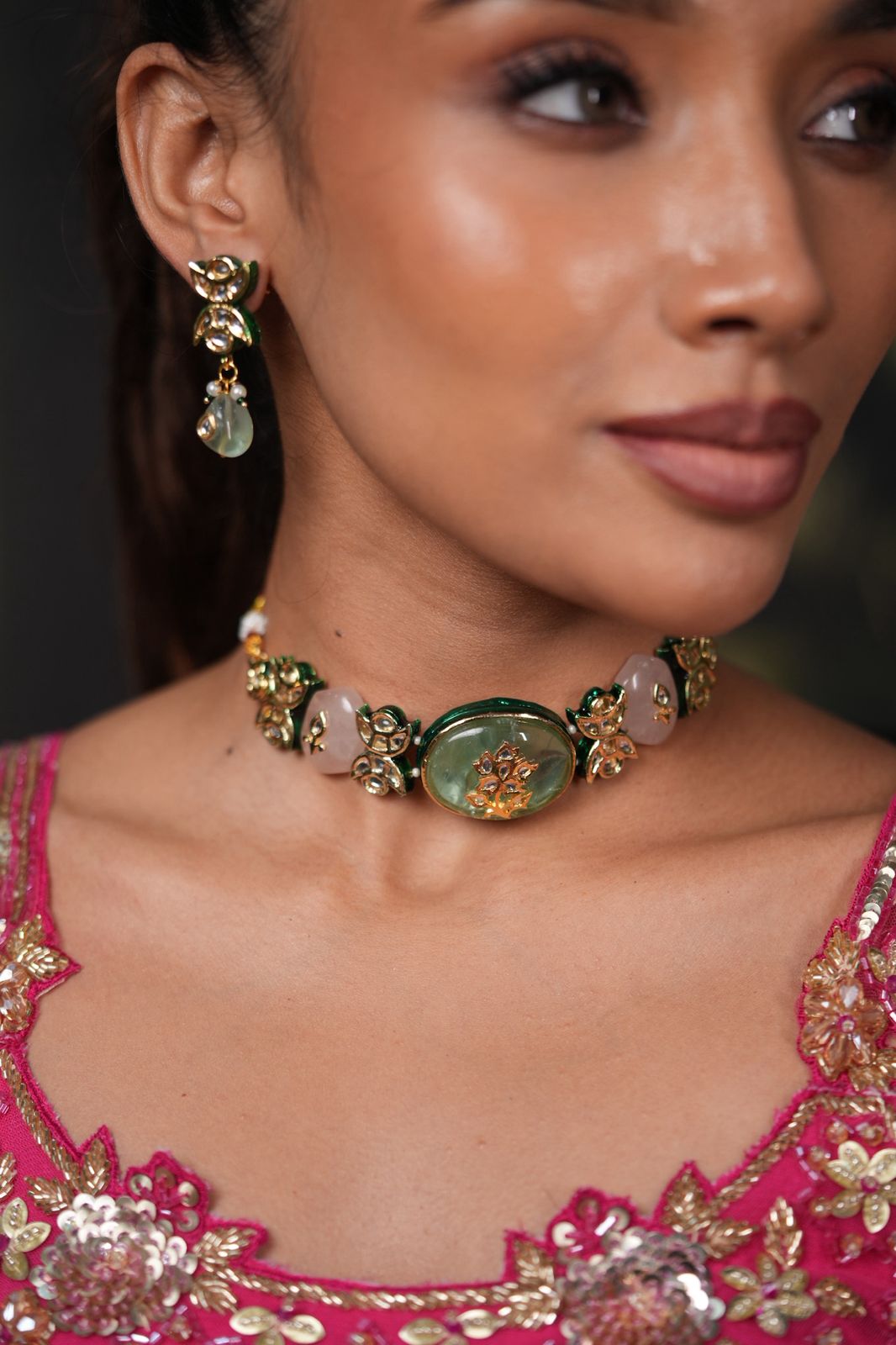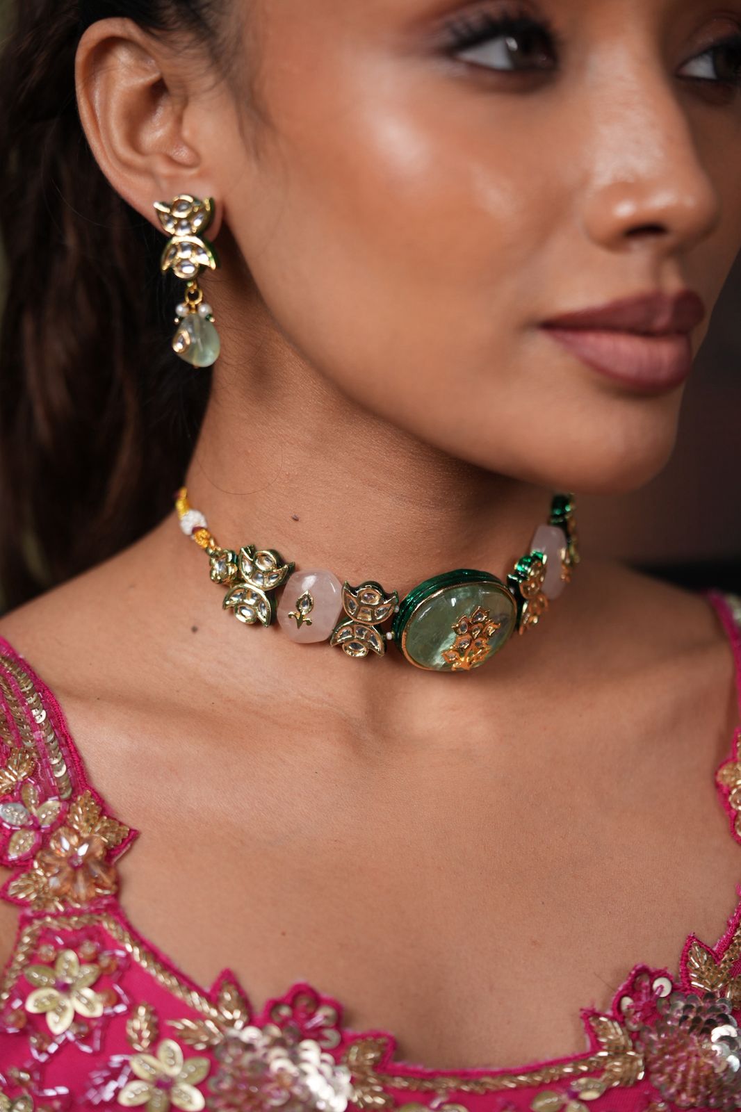 Pink & Mint Indo-Western Choker Set — A stunning fusion piece featuring a striking combination of pink and mint semi-precious stones, adorned with intricate