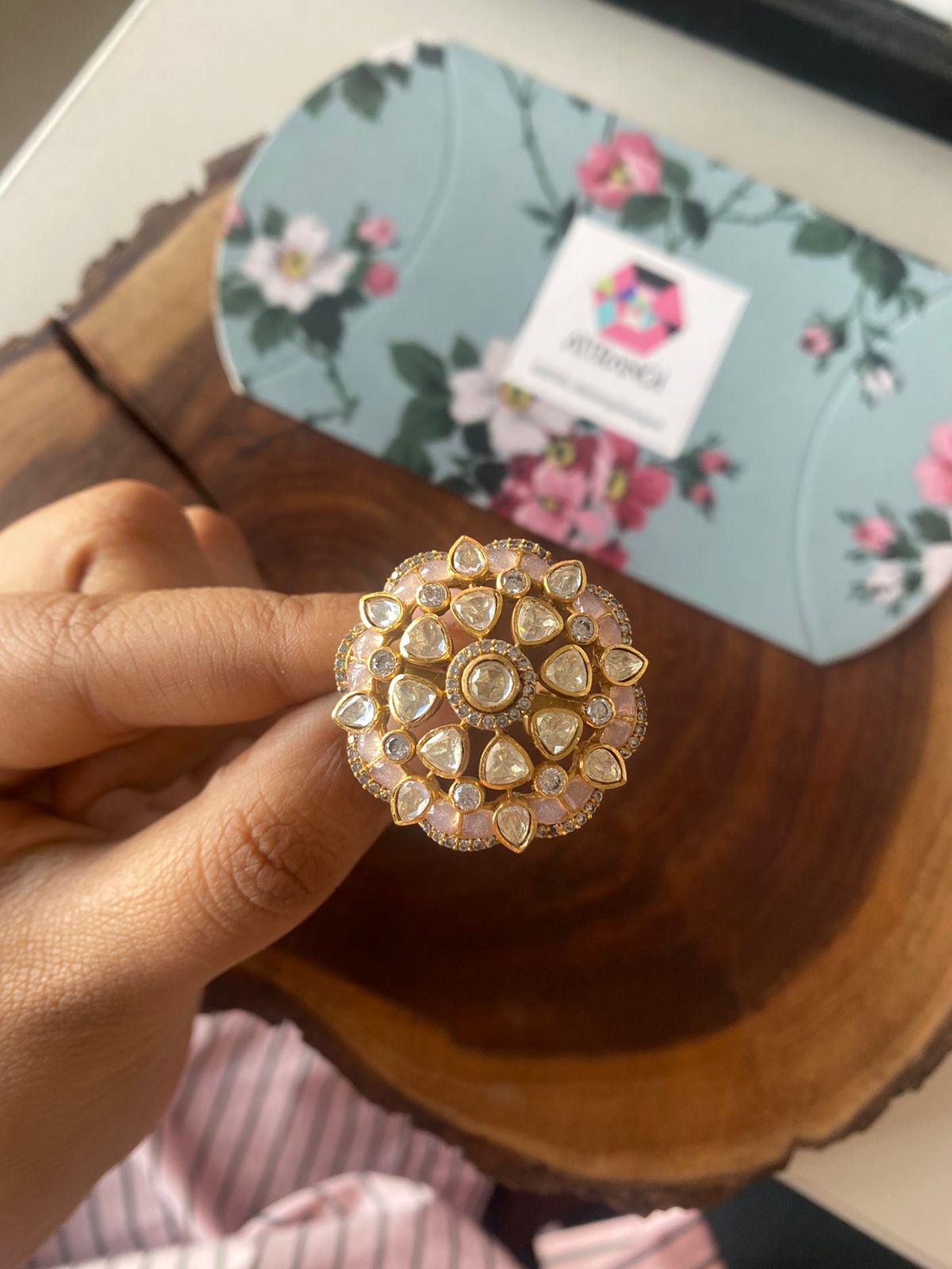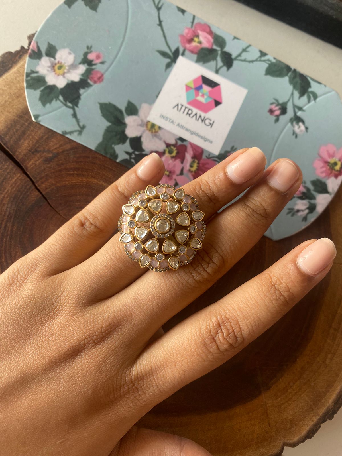 A big oversized Polki floral motif with epoxy Meenakari detailing and studded moissanites. This statement making floral Polki ring stands out from the rest because of its design and colourplay.