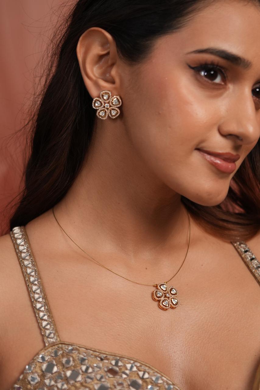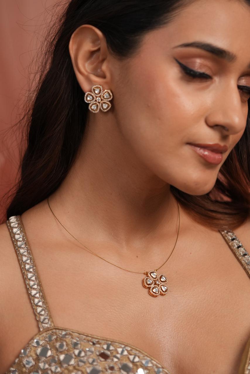 A gorgeous uncut diamond floral pendant with an invisible light Italian chain and studs that match match it with perfection. Graceful and gorgeous, this pendant set is not your usual traditional set, it’s Indo western and stylish.