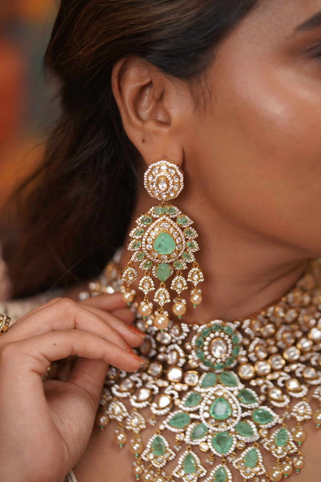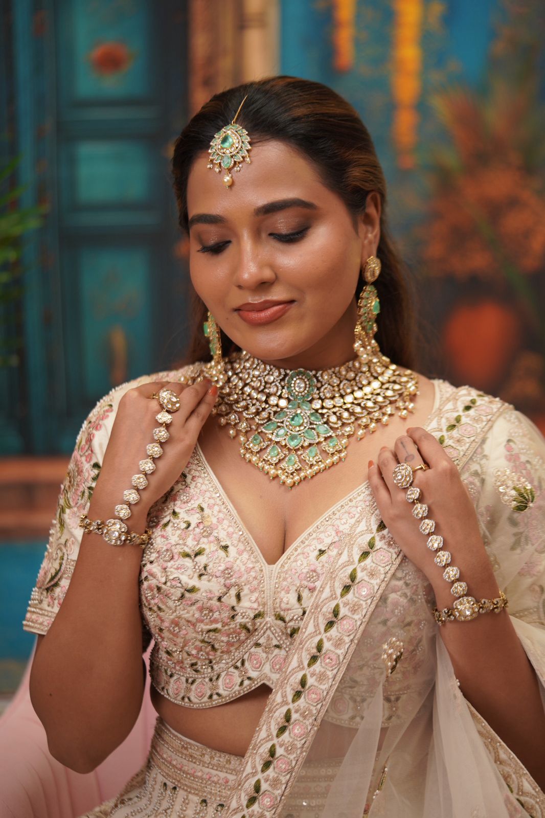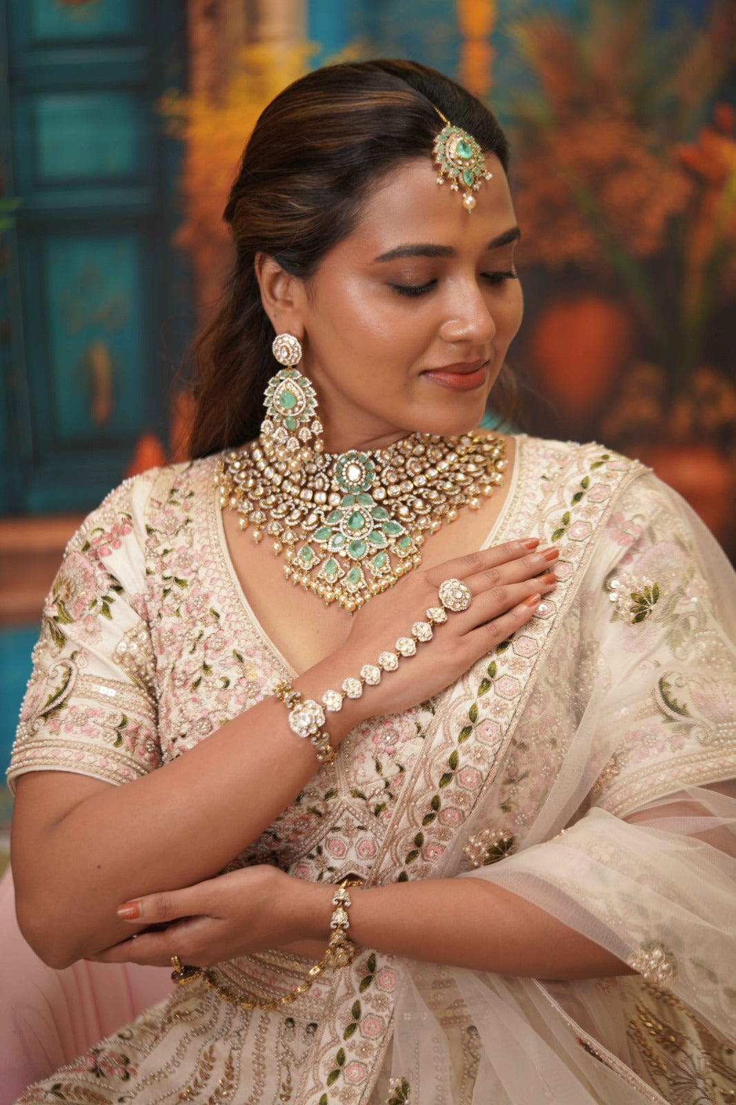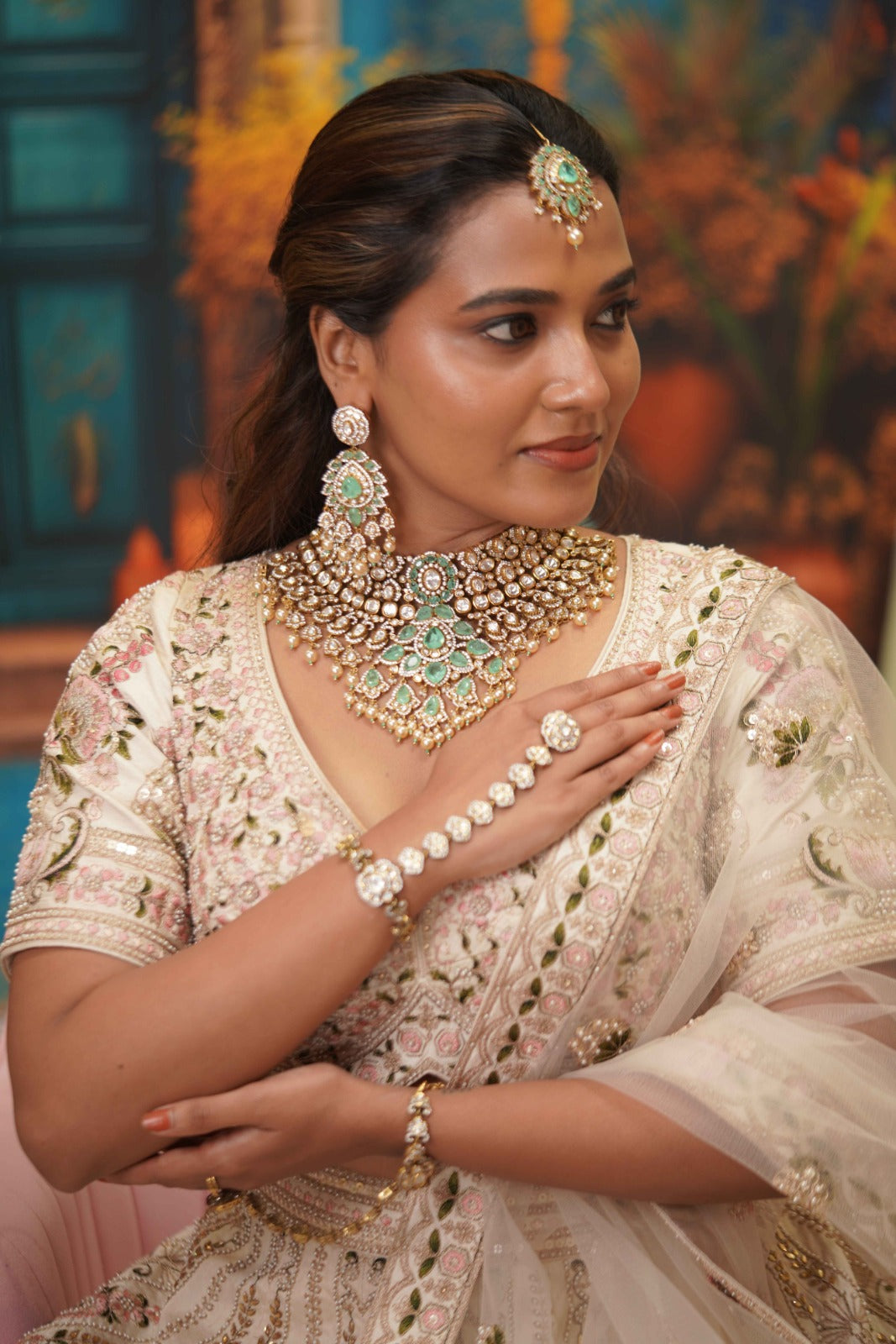 A full blown bridal choker set that has a Russian emerald center piece with floral detailing at the bottom and assembled pearls below. It comes with the most gorgeous tika and Hathpan that look straight out of a heritage collection.