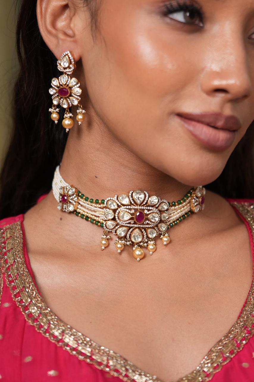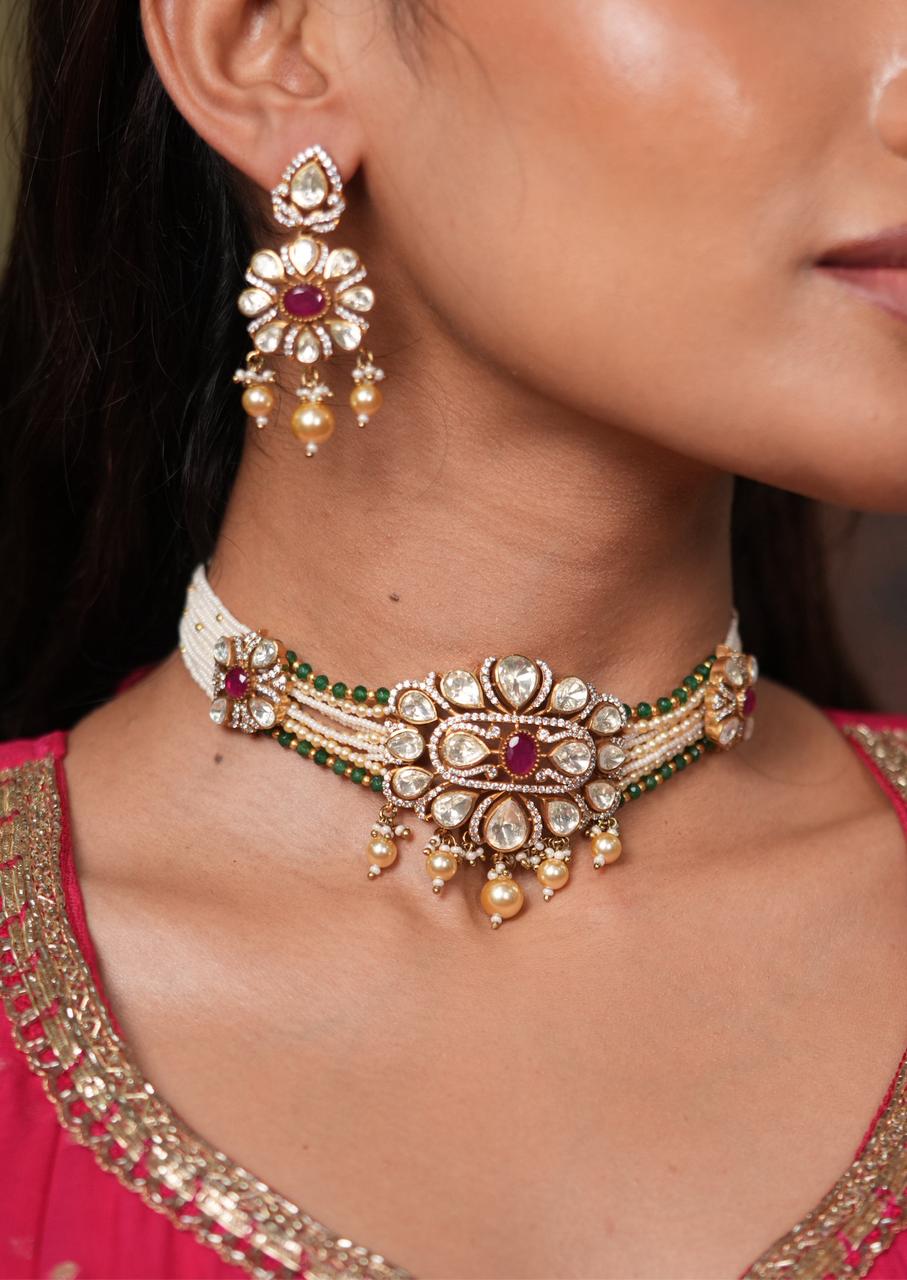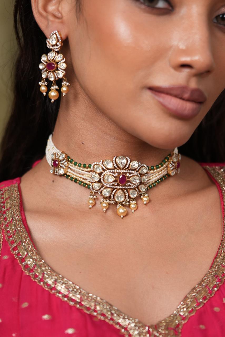 Paaro Polki Moissanite Ruby Emerald Choker Set