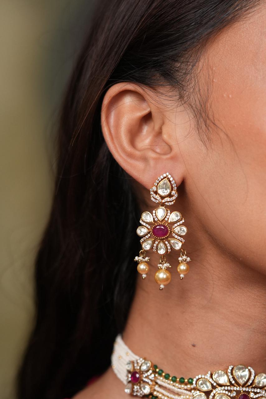 An iconic choker set with pearls and a big Polki motif in the center that has Ruby and emerald detailing. This offbeat choker set matches everything Indian with such ease. A one time buy that would last for years and years of festivities.
