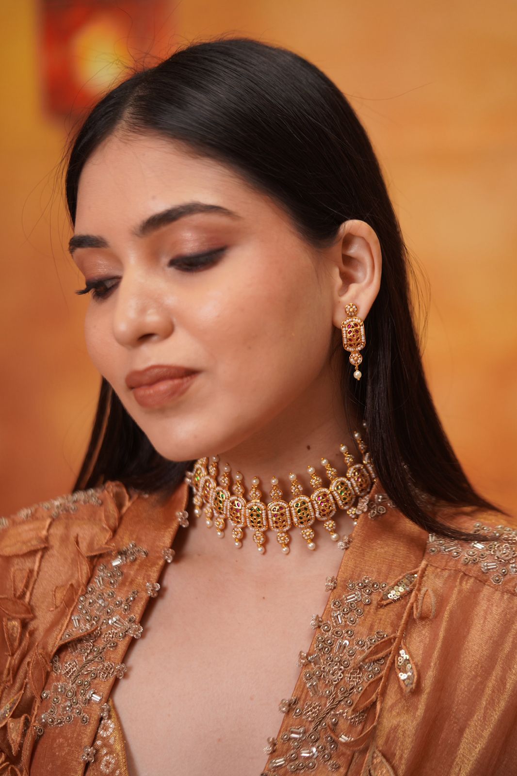 The kind of choker set you have been dreaming off, studded with rubies and emeralds in the center comes with floral pearl detailing above and below and elevated pearls around. The stiff mid sized earrings are statement makers by itself.