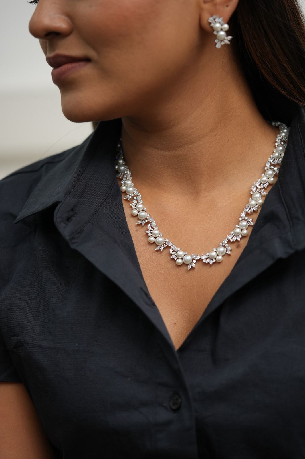 A dainty pearl and diamond necklace adorned with tiny pearls and pear- and marquise-shaped diamonds, creating an enchanted, princess-like aura. A super charming floral set that radiates timeless grace.