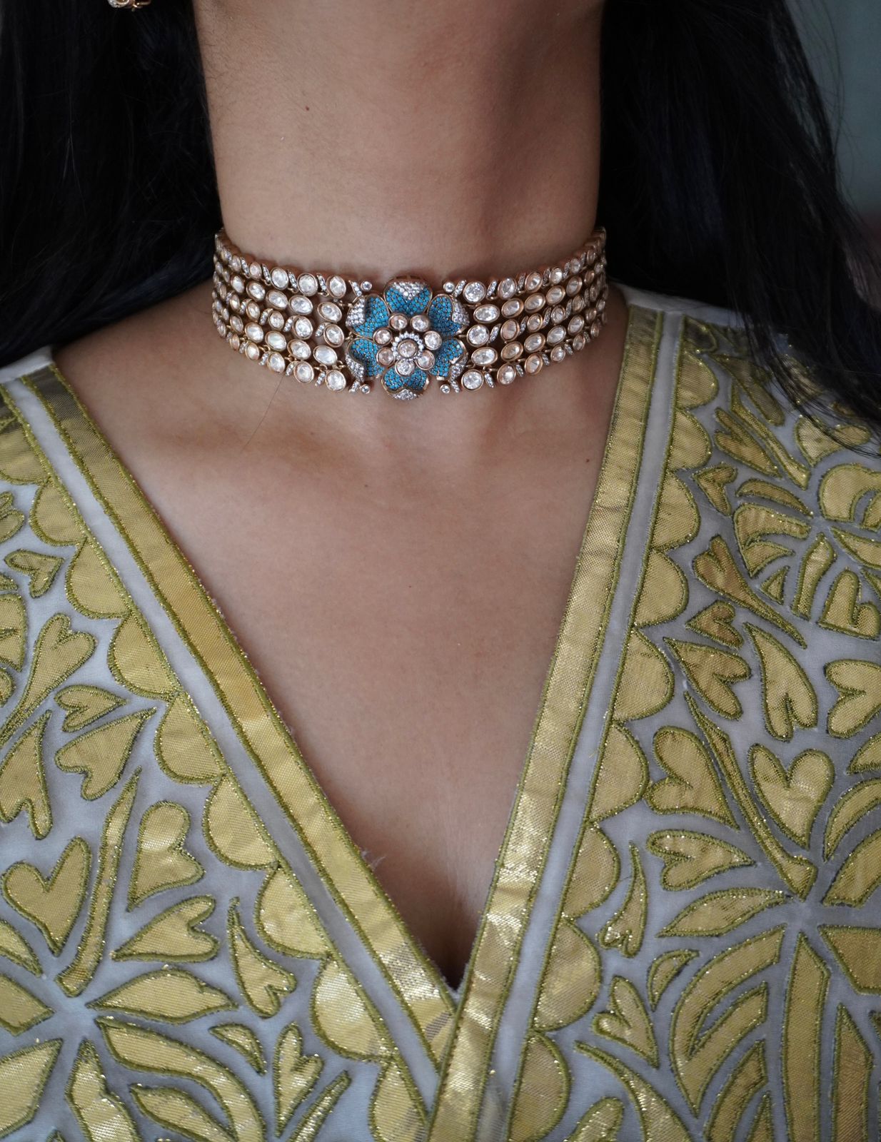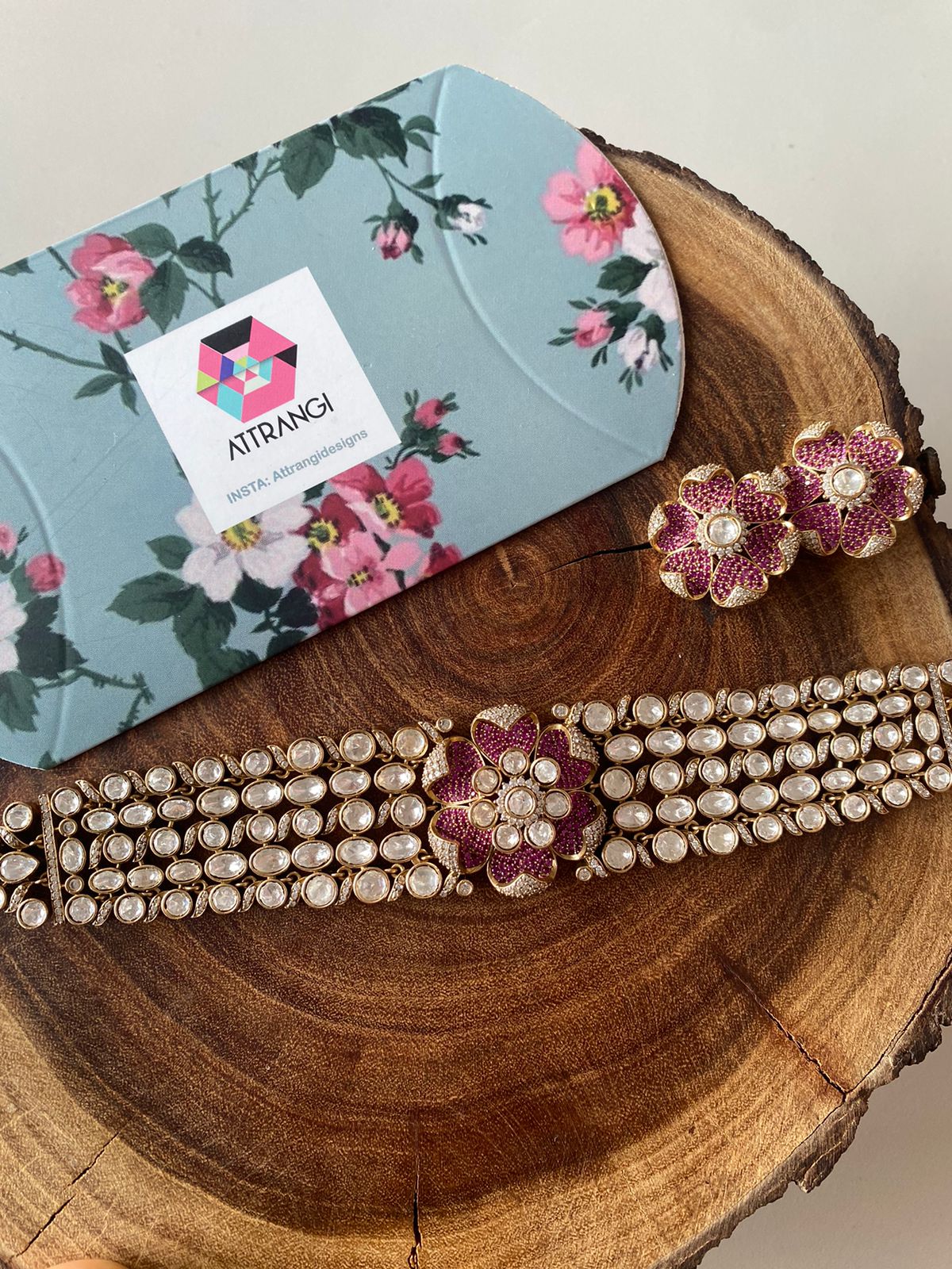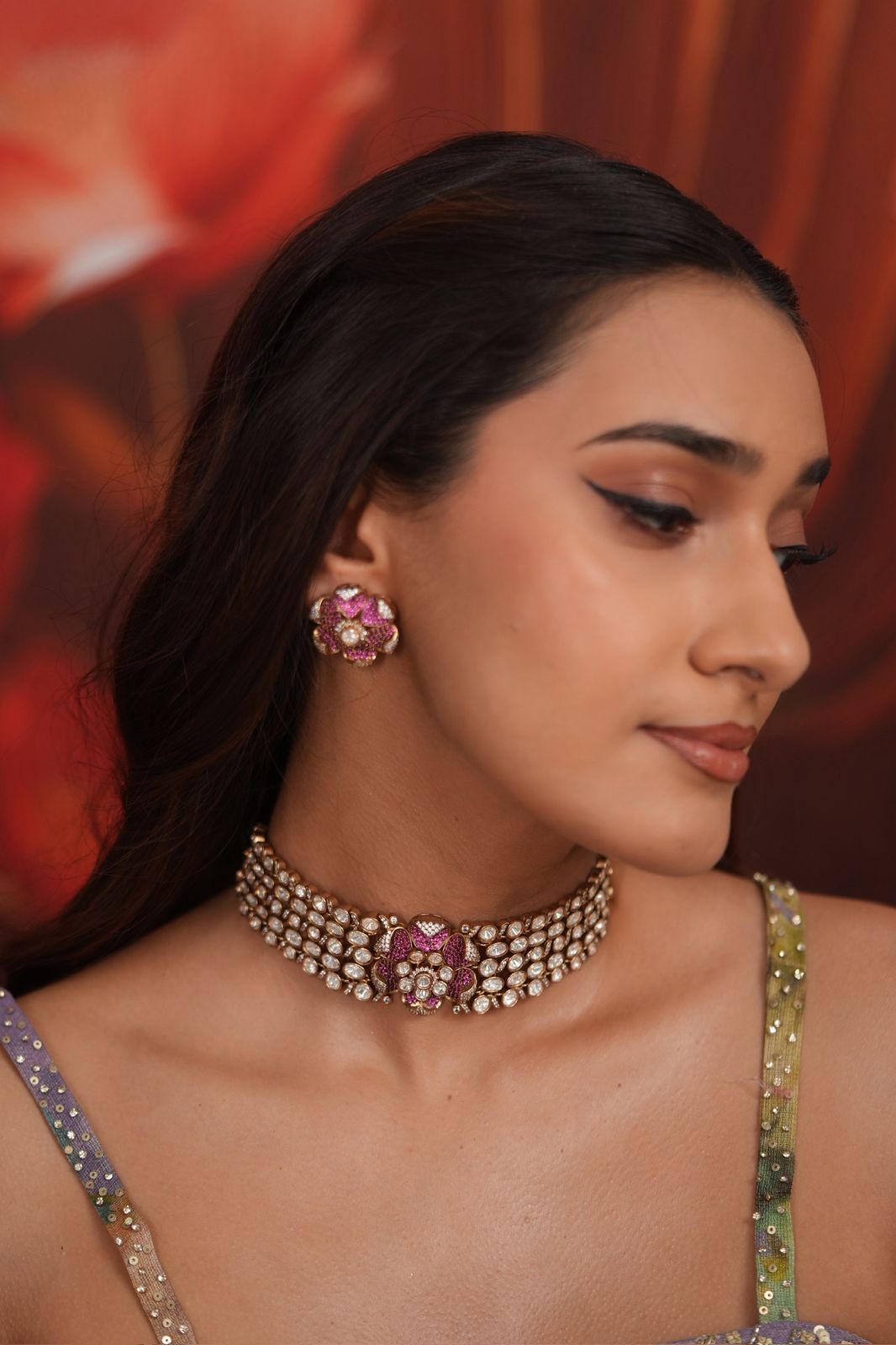The most offbeat quirky choker set with a floral coloured stone flower with moissanites in the center surrounded by uncut diamonds on the sides this gorgeous choker set is one of our favourite designs, for a reason. Super wearable! Super affordable!