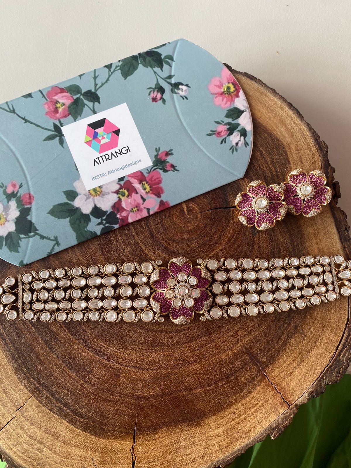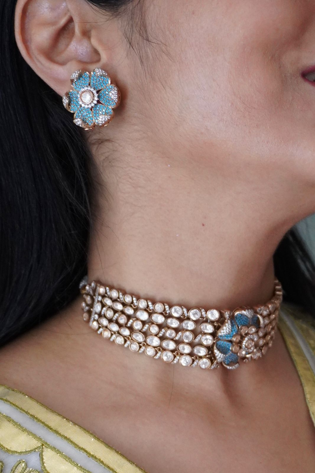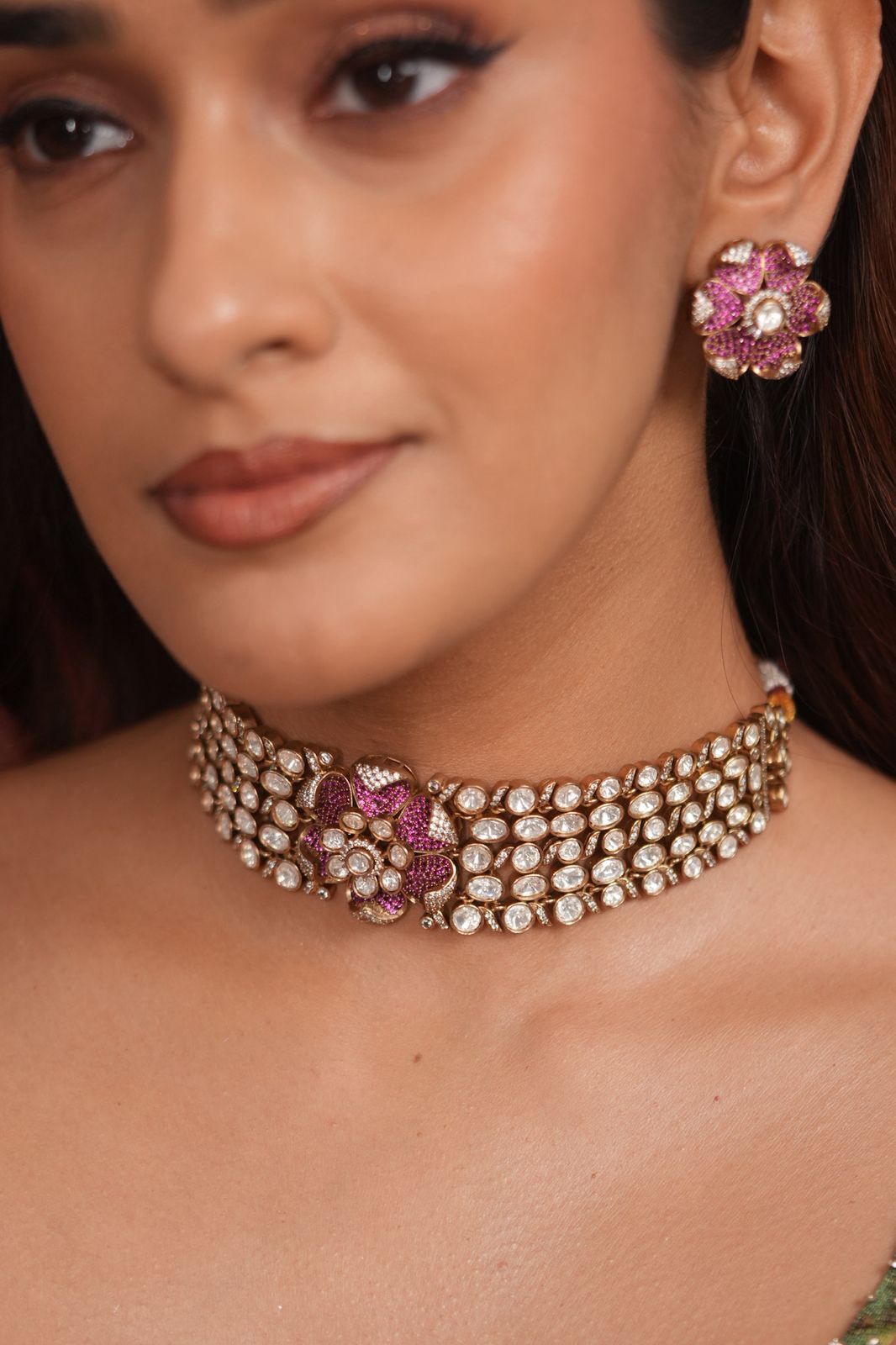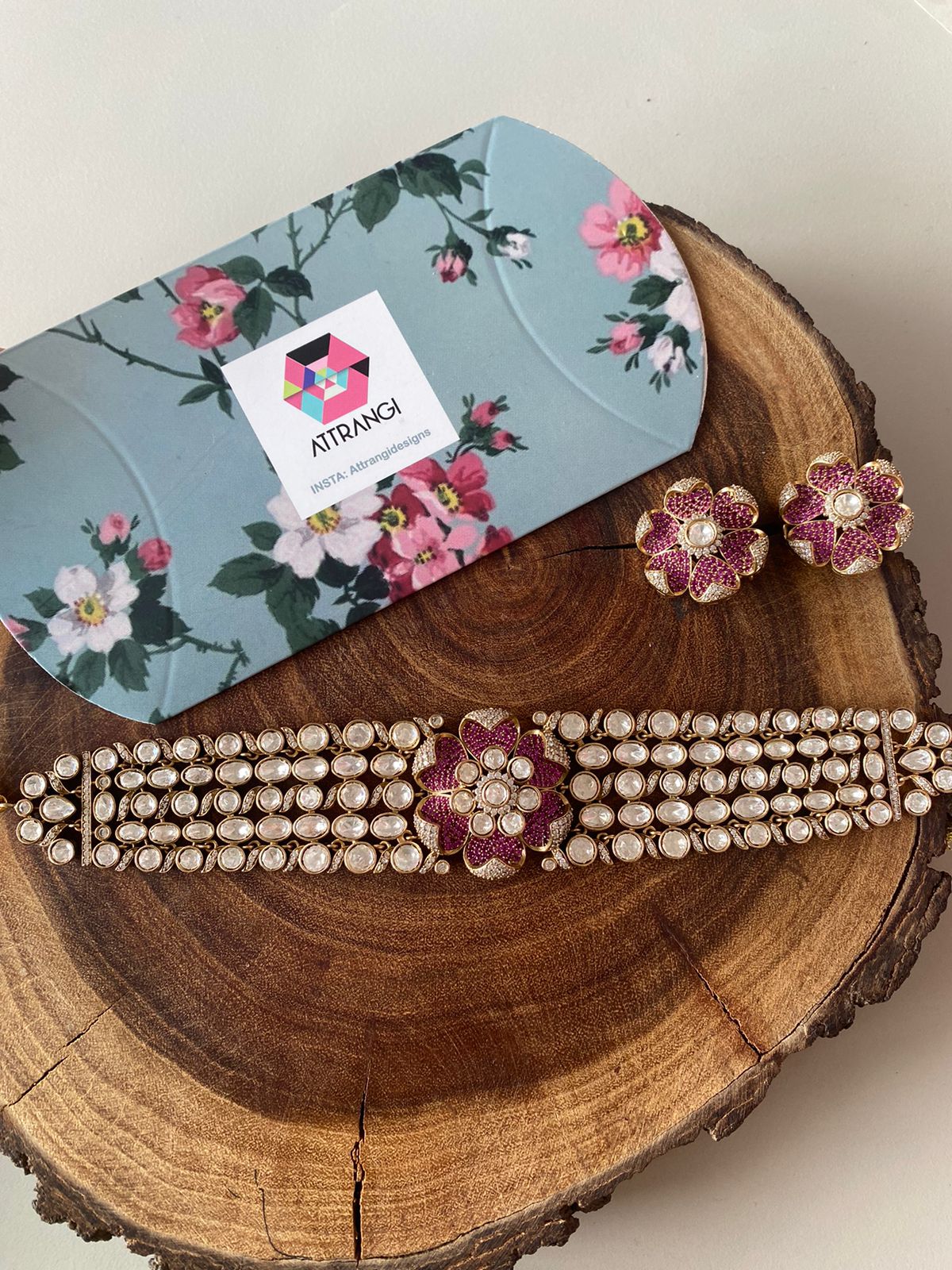The most offbeat quirky choker set with a floral coloured stone flower with moissanites in the center surrounded by uncut diamonds on the sides this gorgeous choker set is one of our favourite designs, for a reason. Super wearable! Super affordable!