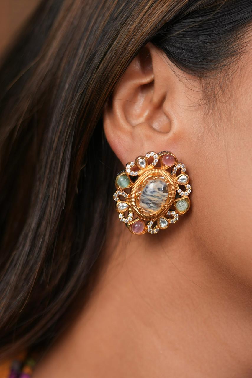 Indian studs from our Sabhya range of multi gemstone multi coloured jewellery. These pair of statement oversized studs look pretty on a shirt or on a saree, you'll be shocked at the multiple ways in which it can be styled.