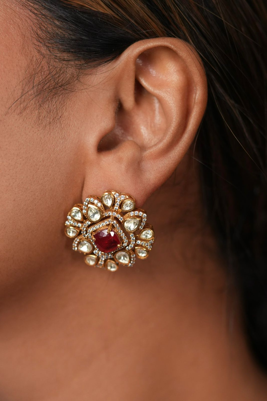 Polki Moissanite studs with a coloured stone in the center. When they said you can’t go wrong with classics, they meant you can’t go wrong with Sarita, just because that’s how iconic it actually is. Super wearable, super versatile!
