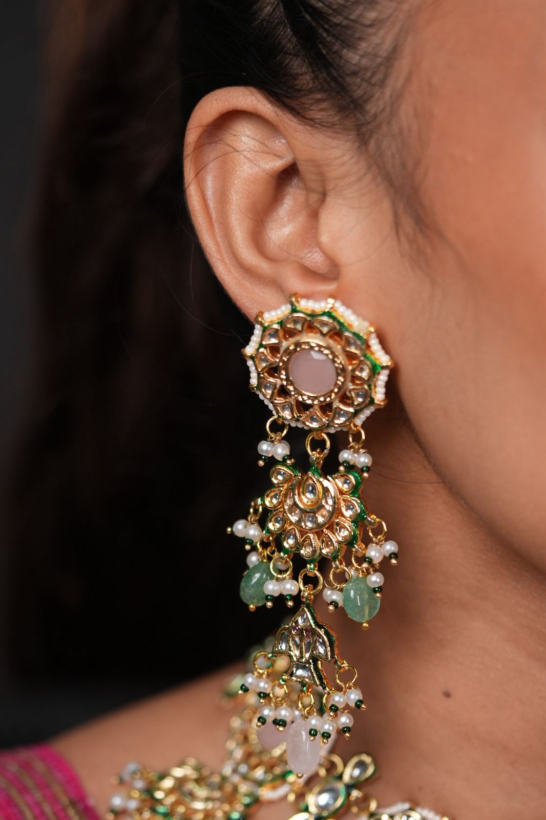 Sera Pink Mint Heavy Kundan Set With Long Earrings