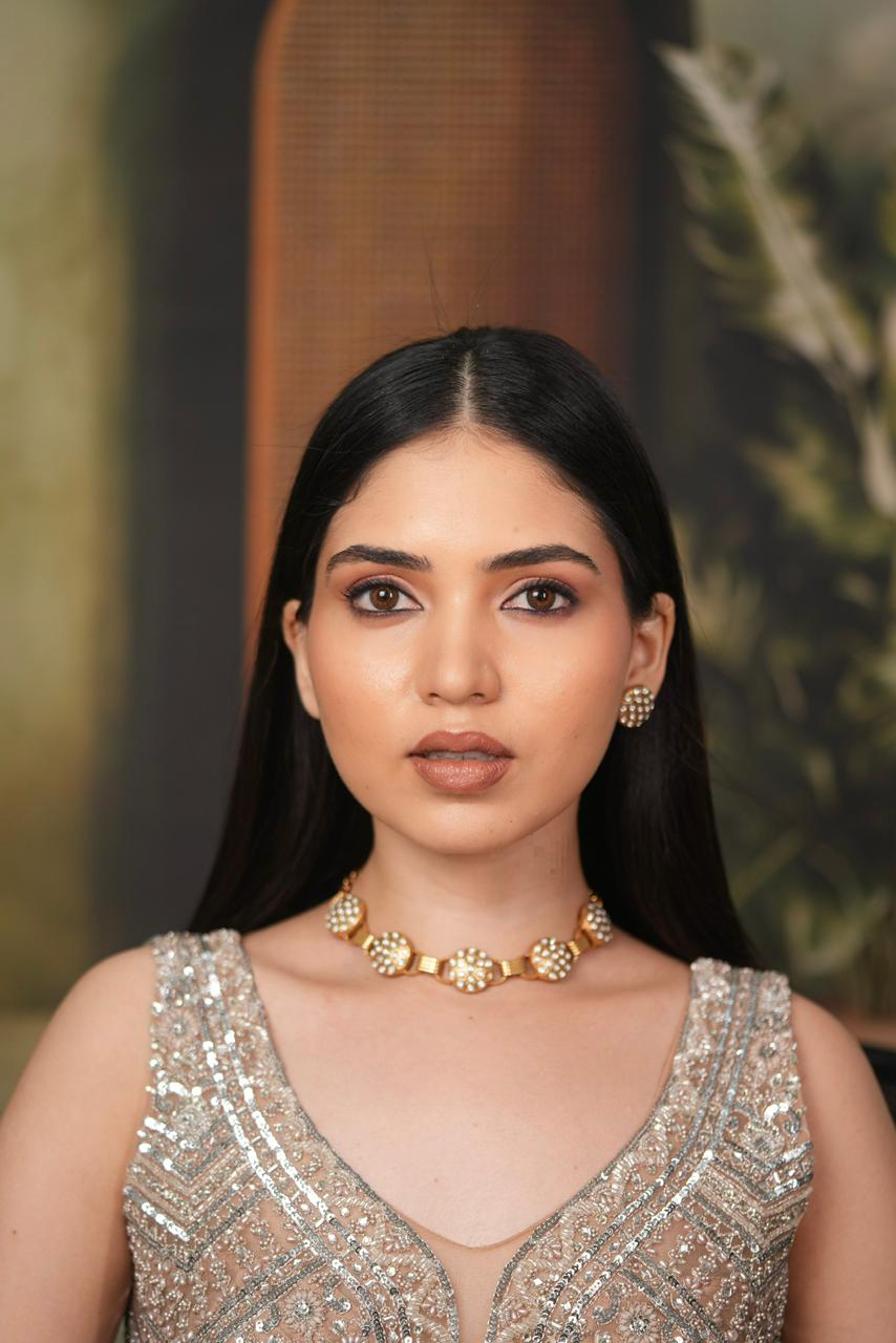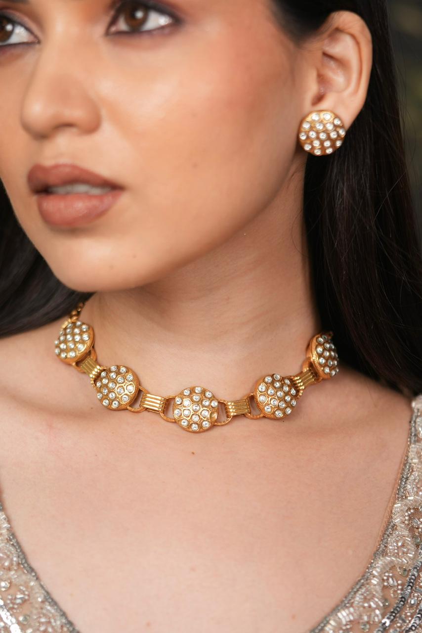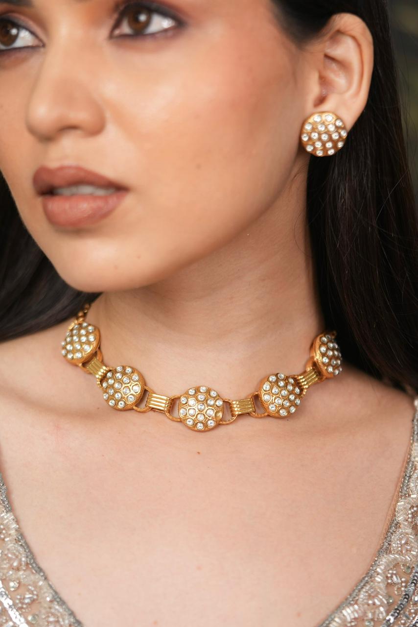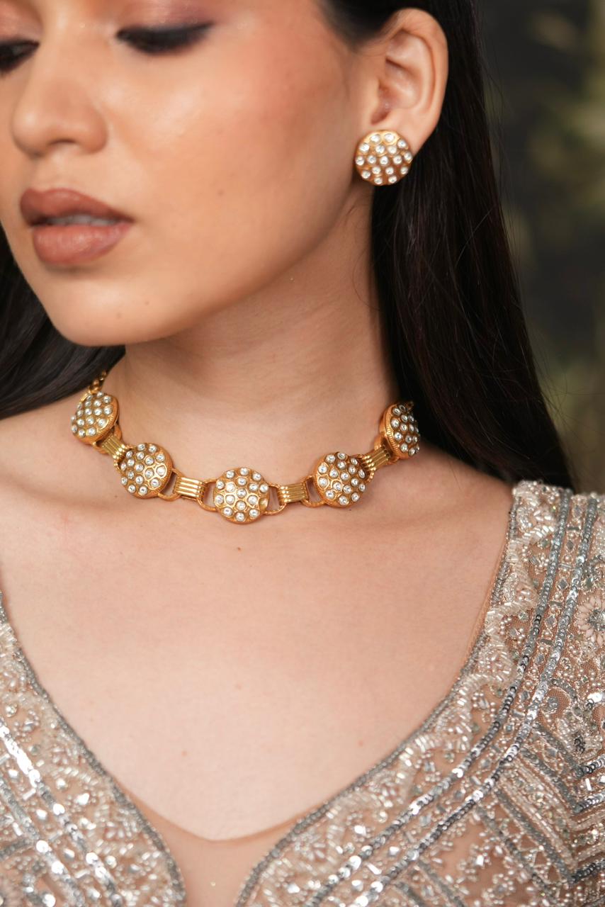 Graceful and radiant, the Shubhra Gold Choker Set features a striking arrangement of circular gold motifs encrusted with sparkling stones. Inspired by the meaning of Shubhra—pure and luminous—this choker adds effortless charm to both modern and traditional looks. A perfect pick for celebrations, weddings, or when you simply want to shine.