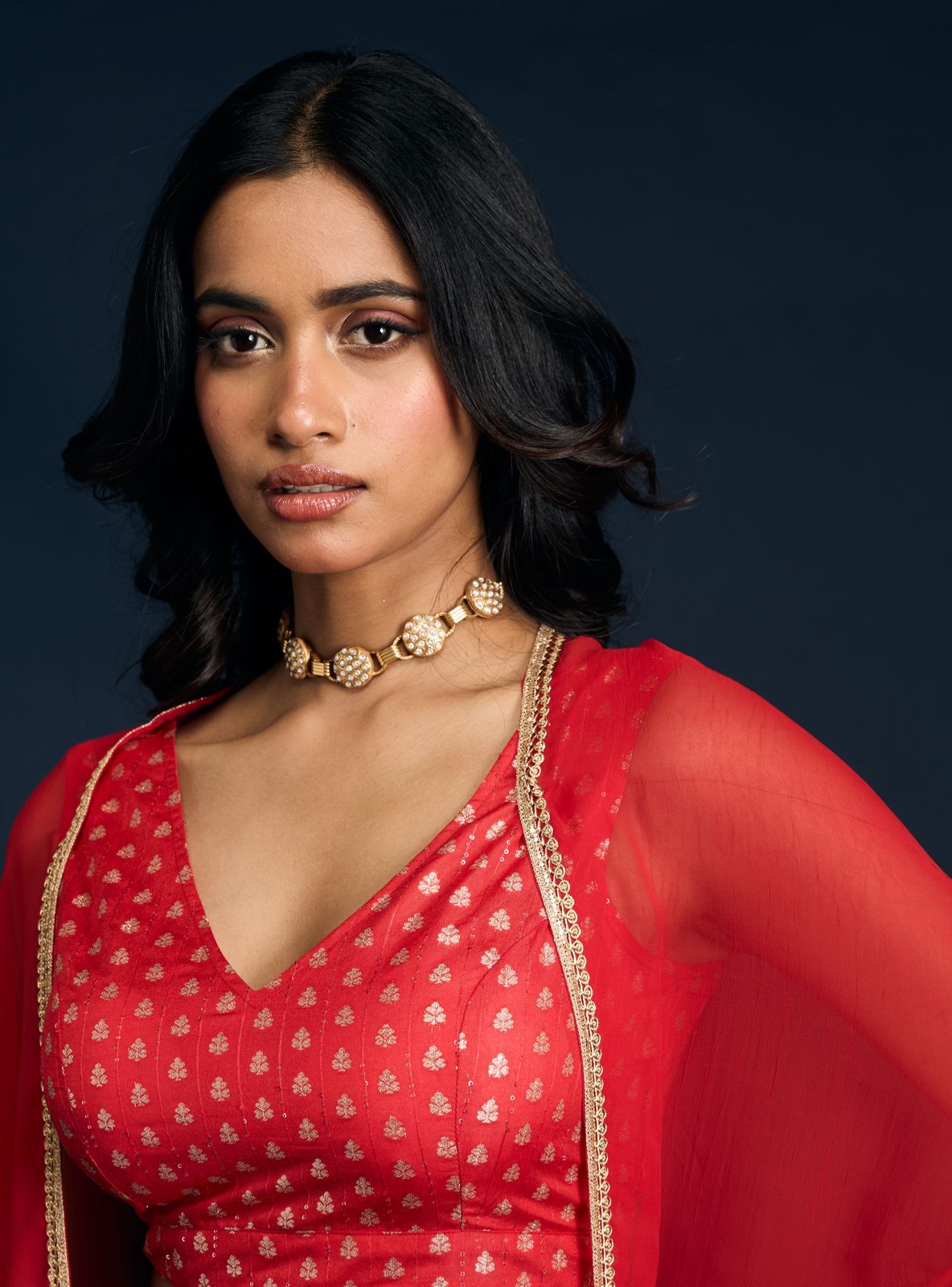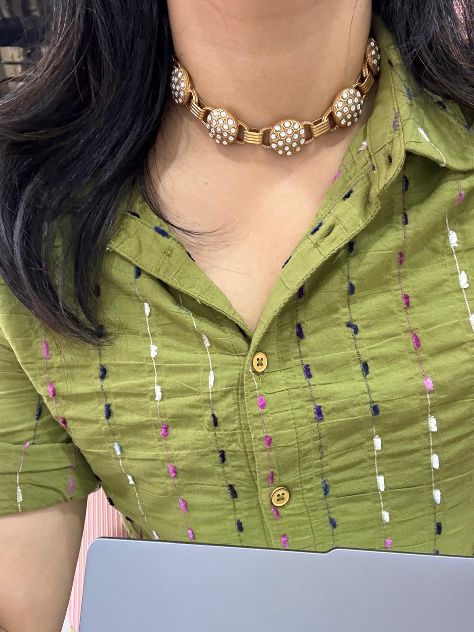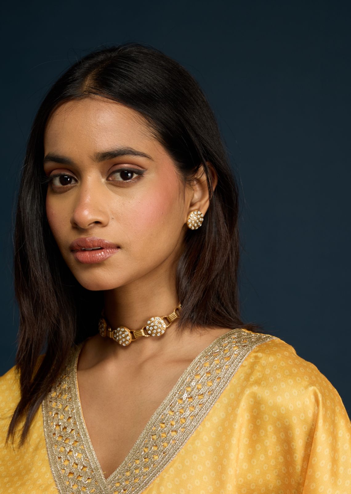 Graceful and radiant, the Shubhra Gold Choker Set features a striking arrangement of circular gold motifs encrusted with sparkling stones. Inspired by the meaning of Shubhra—pure and luminous—this choker adds effortless charm to both modern and traditional looks. A perfect pick for celebrations, weddings, or when you simply want to shine.