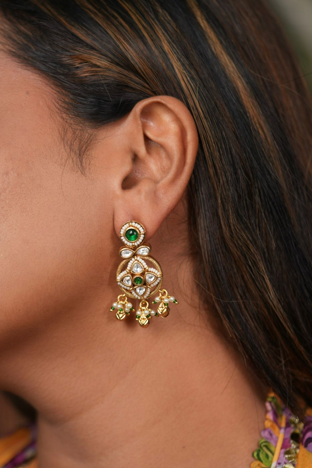 Chandbali style drop earring in gold concept along with polkis and rubies and emeralds. A design that will stay classic and loved forever.