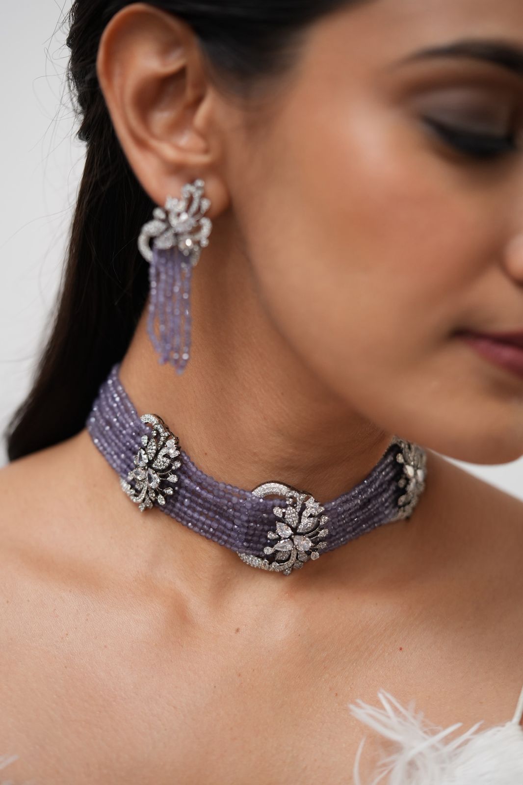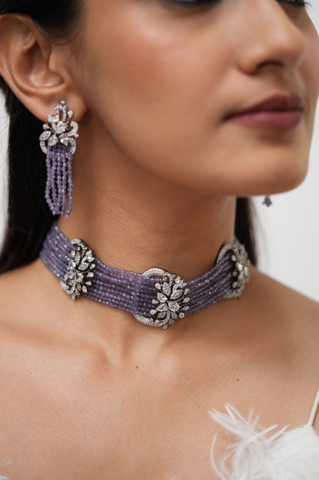 A heavy diamond choker set with inlay crystals around the floral motifs and dangler earrings that shine bright through the victorian polish.