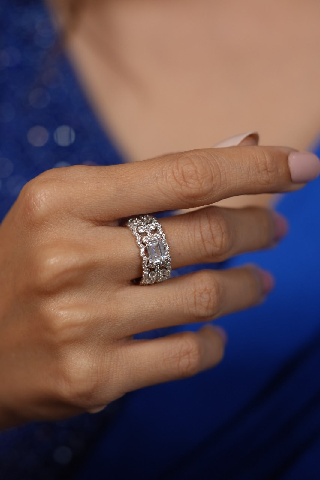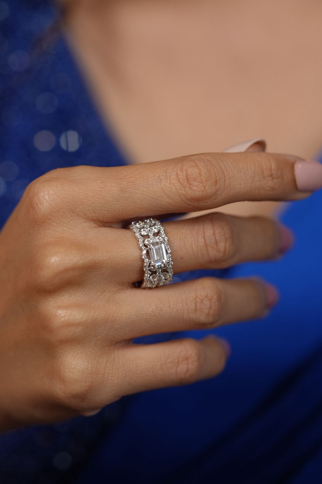 A sleek 1 carat emerald cut solitaire sits at the center, offering a clean, refined sparkle with understated elegance. It’s surrounded by intense diamond detailing that’s  Minimal yet striking, this ring adds a quiet sophistication that complements every look effortlessly.