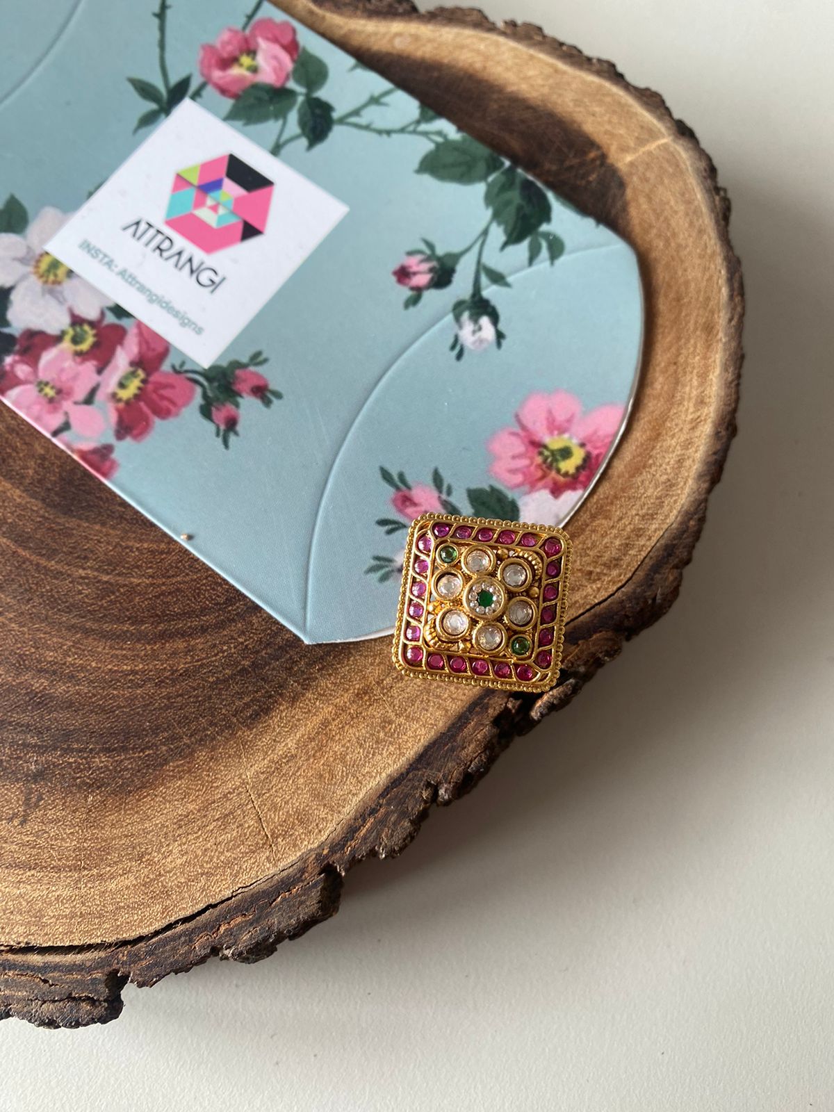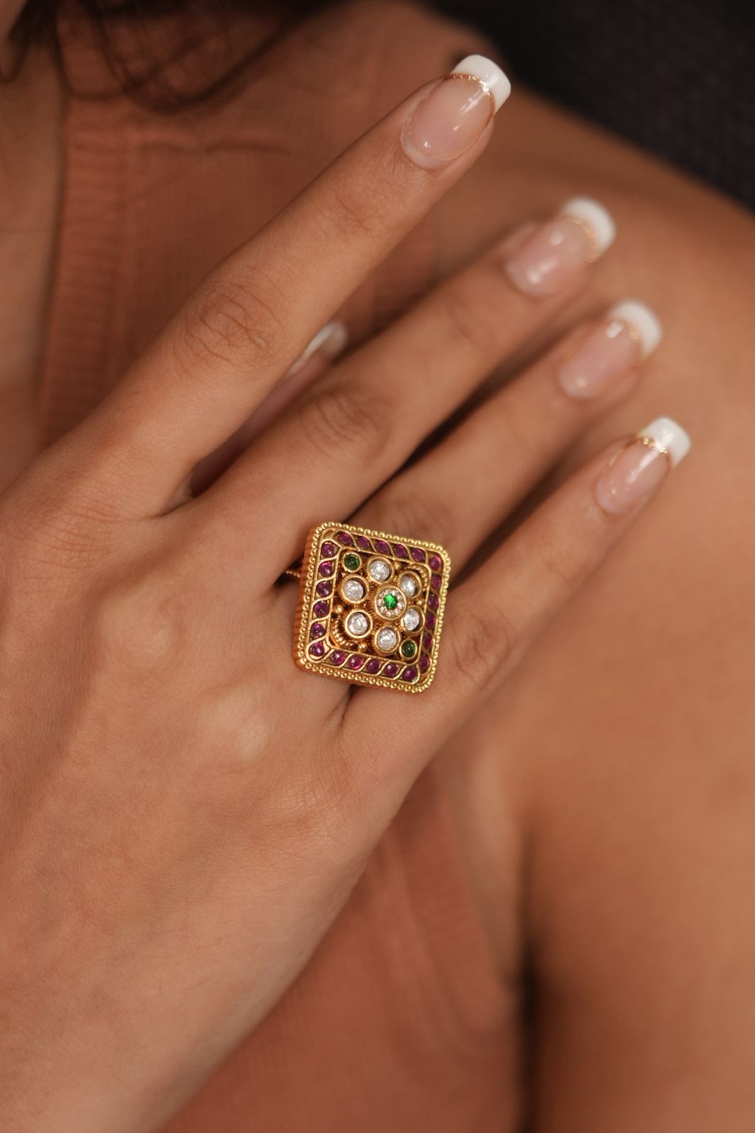 An Indian ring that has the beauty of polkis emeralds and rubies fused together in an offbeat shape. This indo western ring has that perfect desi touch