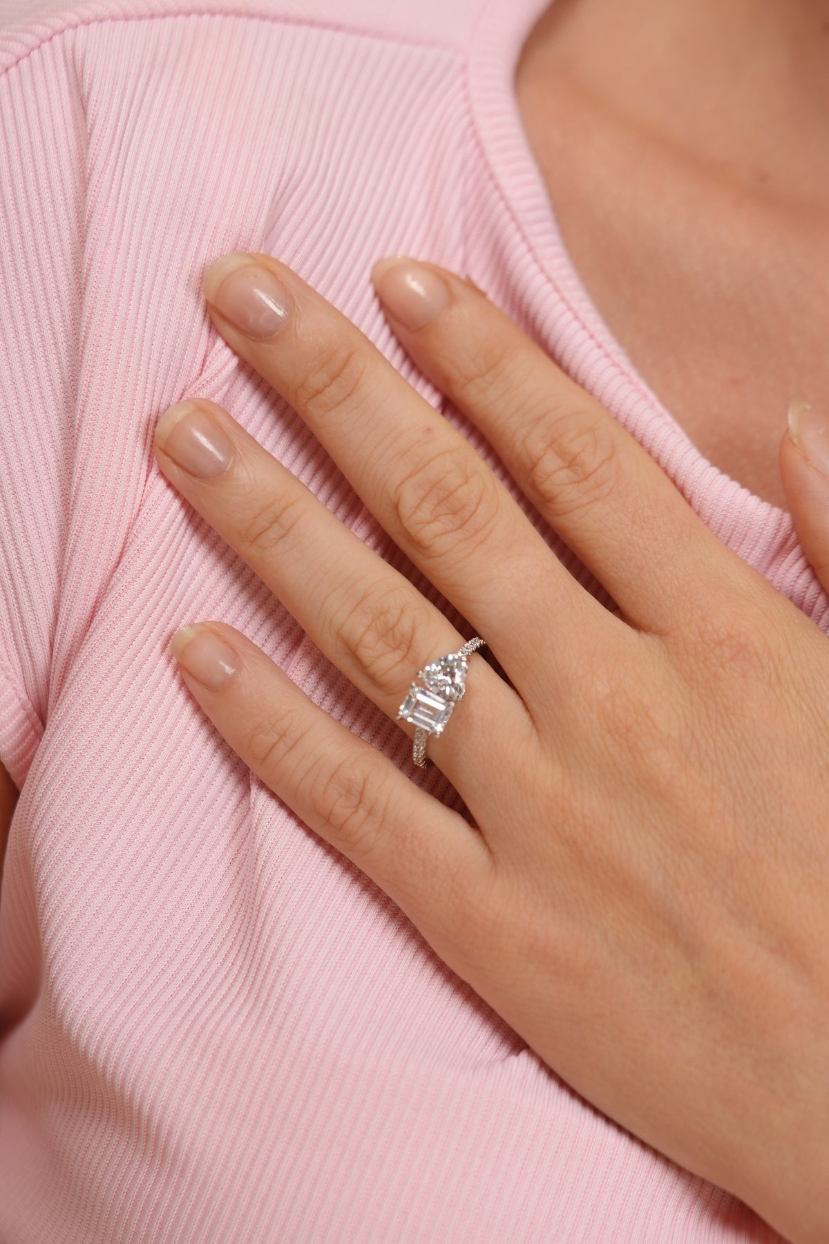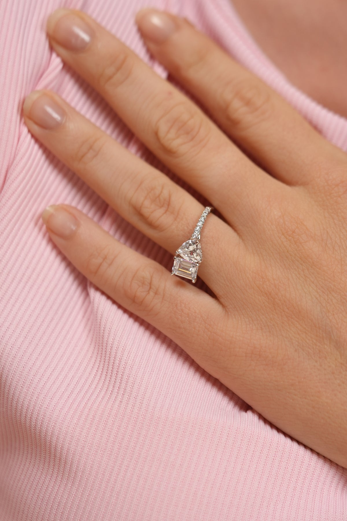 A romantic Toi et Moi design featuring a heart and emerald-cut diamond, symbolizing two souls united in elegance.