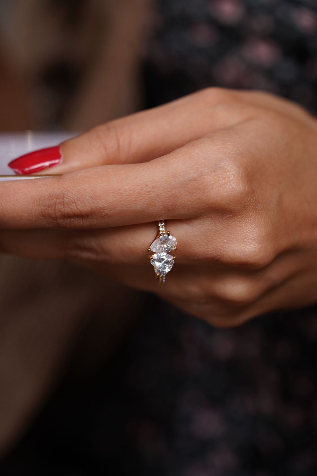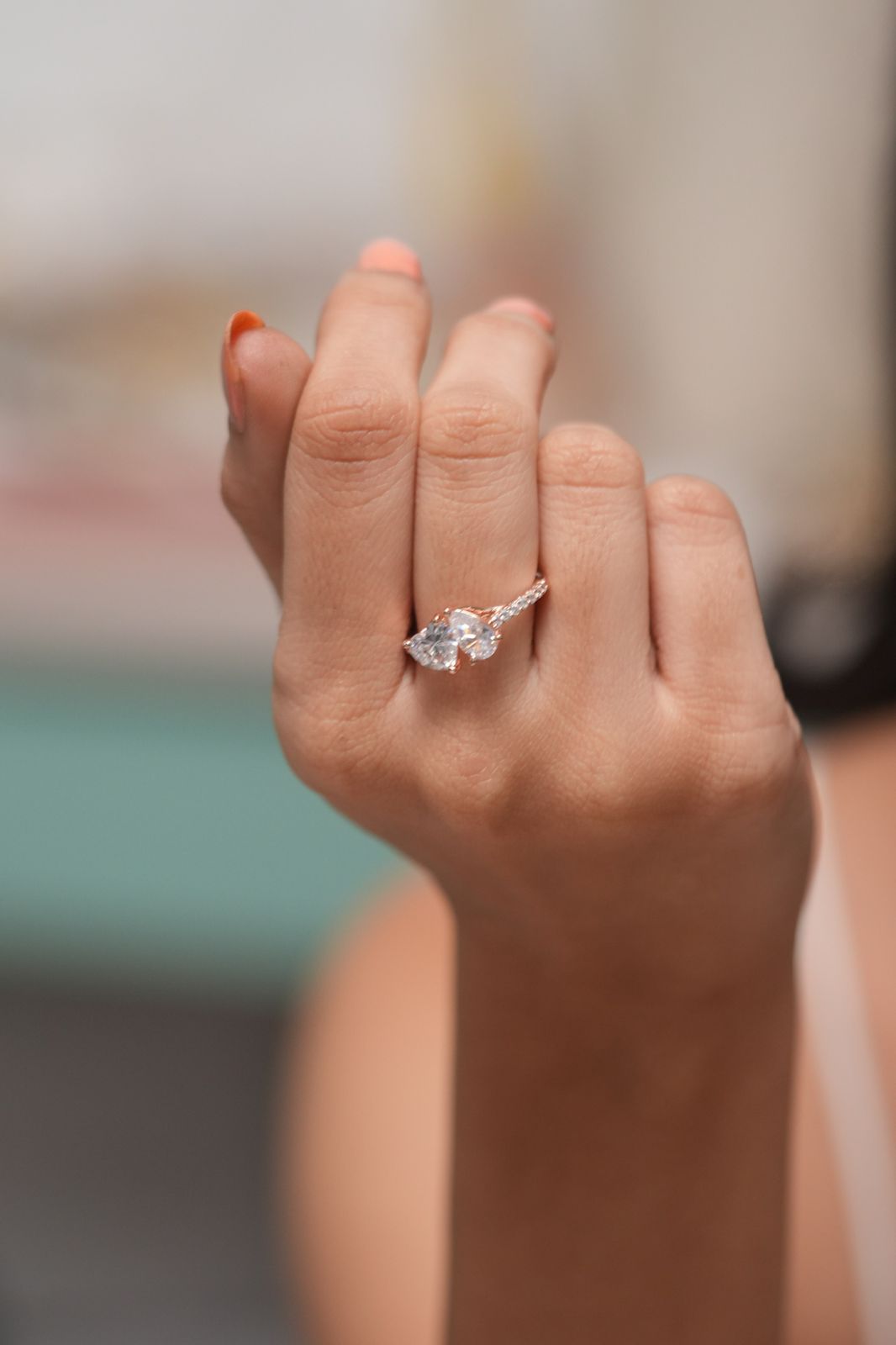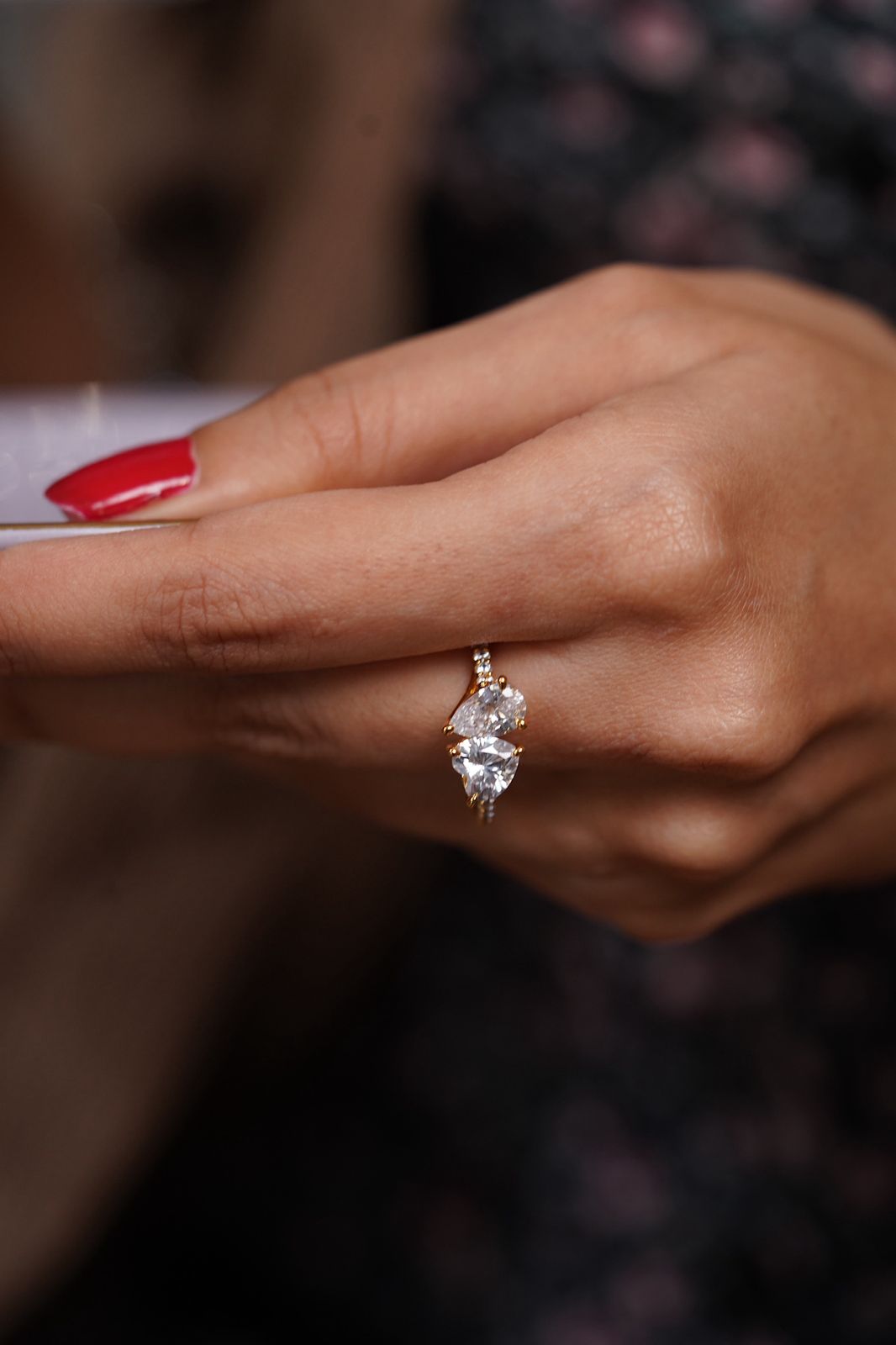 A gorgeous engagement ring with a pear shaped soltiaire and a heart adjacent to it. This everyday pretty ring, is a visual treat for anyone seeing  your fingers!
