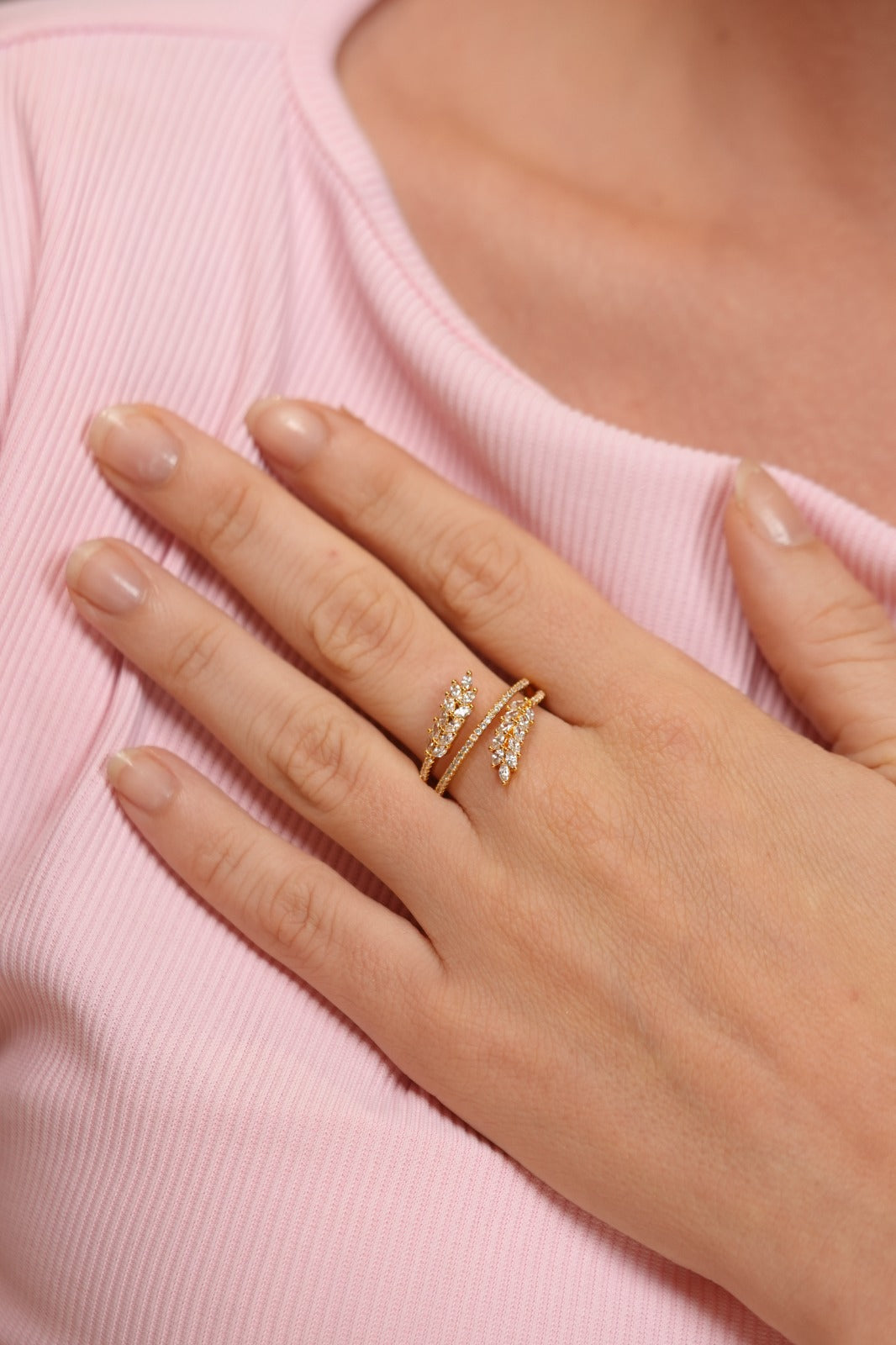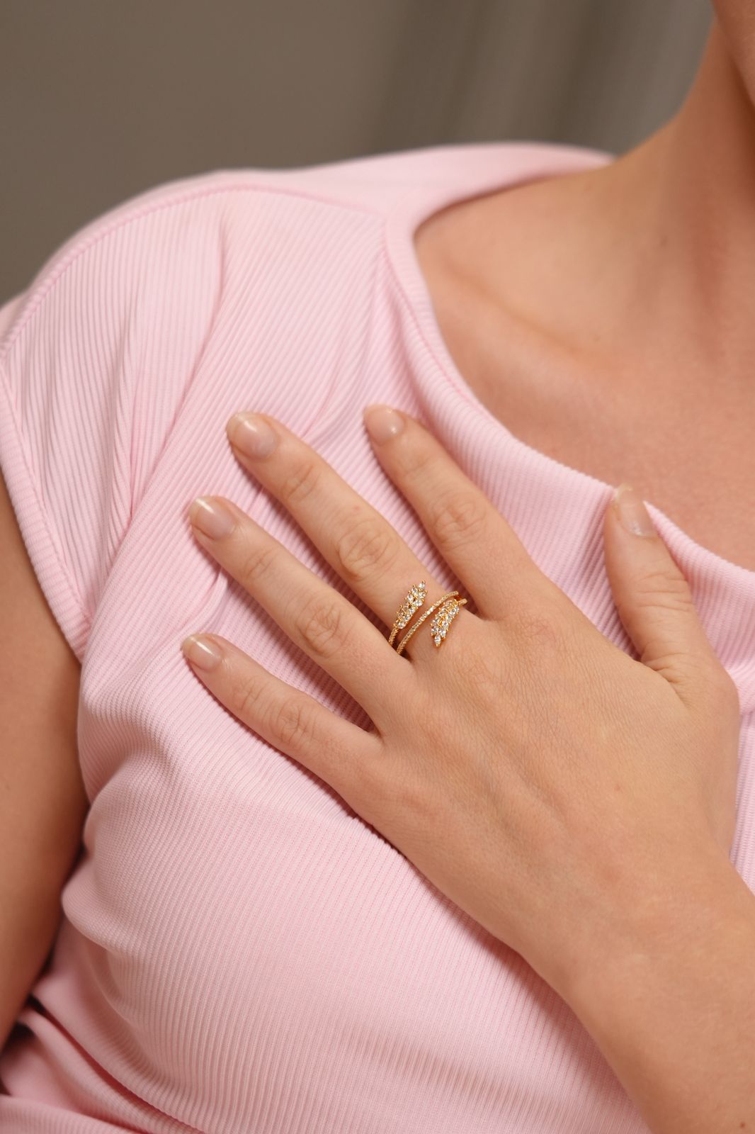 A delicate three-line wrap ring inspired by graceful leaf branches, adorned with shimmering diamonds for a soft, nature-kissed sparkle. Lightweight yet eye-catching, it brings a fine jewellery feel with intricate detailing and effortless elegance.
