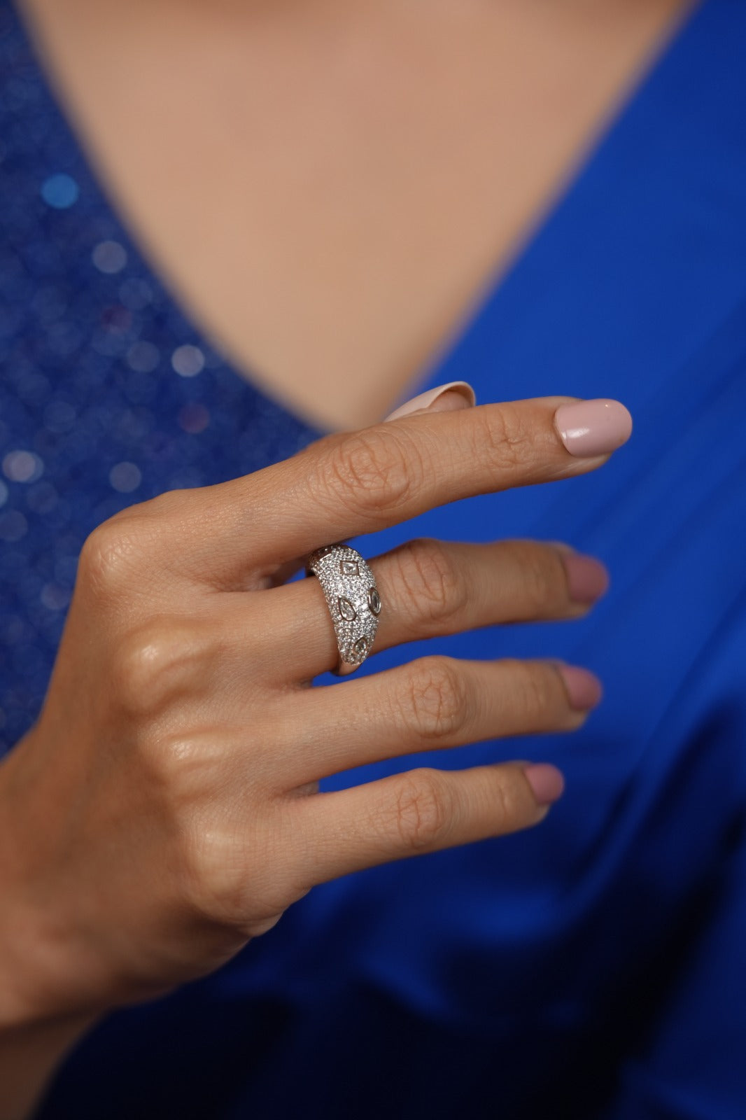 A clustered play of super tiny diamonds in assorted shapes, thoughtfully differentiated yet blended into a soft, seamless design.