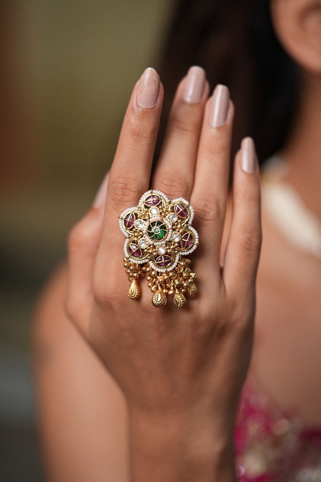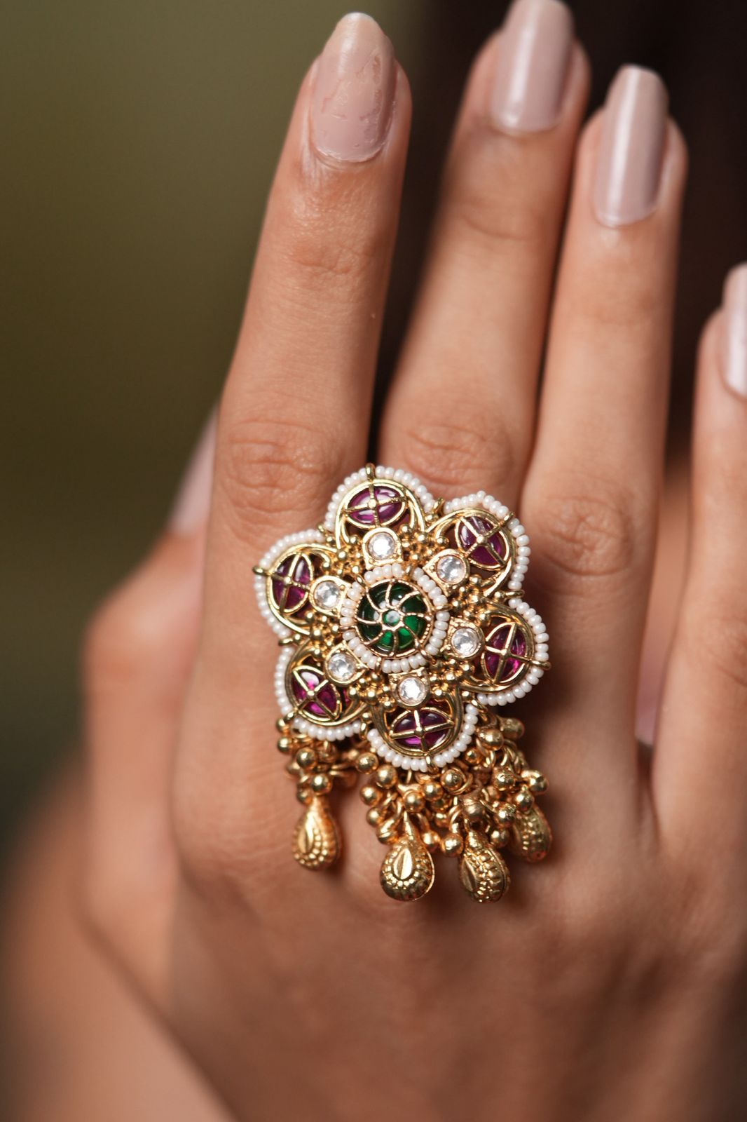 An adjustable gold ring with rubies and emeralds and polkis and gold beads at the bottom. This adjustable statement ring is a traditional dream! Matches well with our Rekha set too.