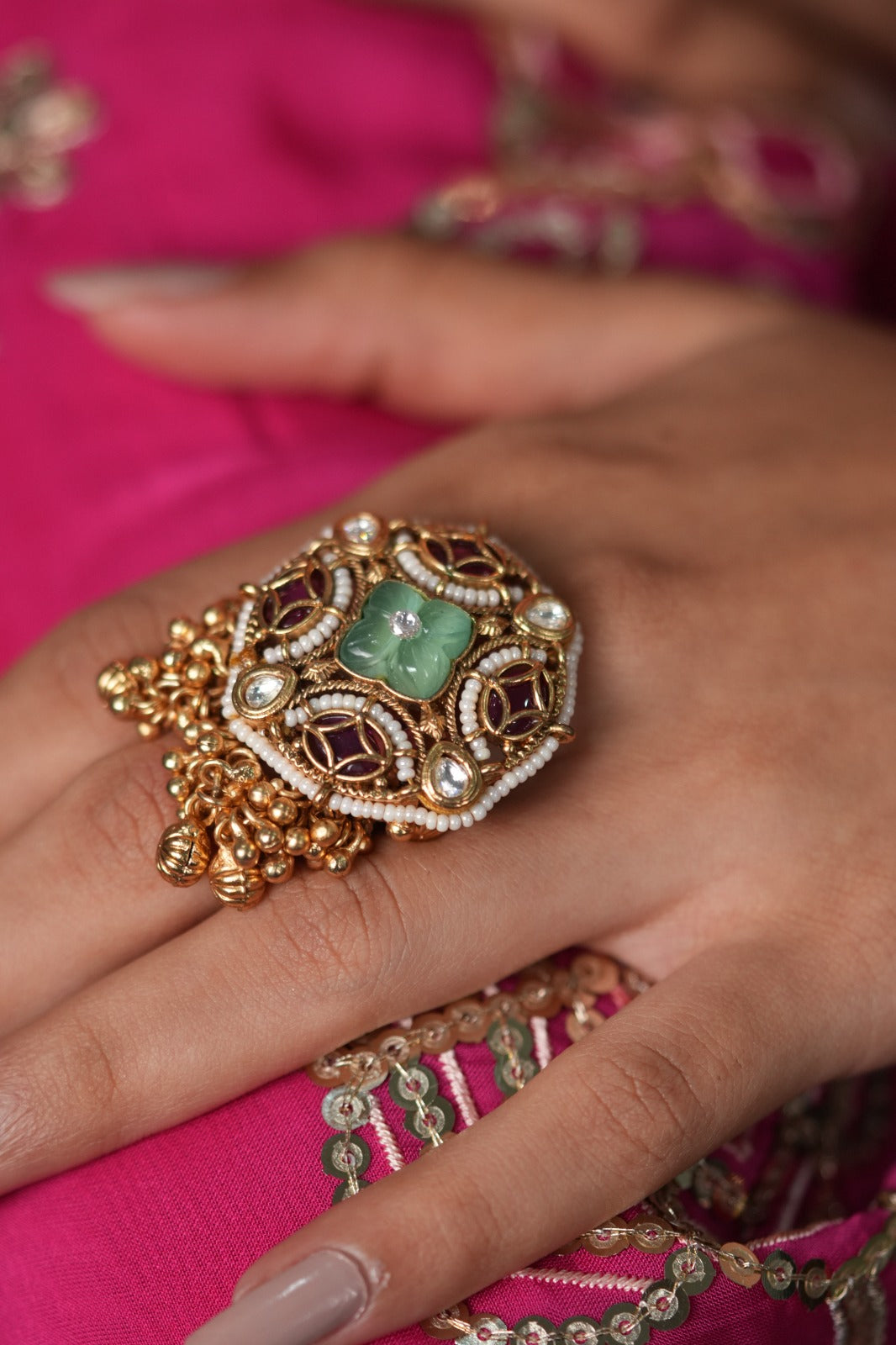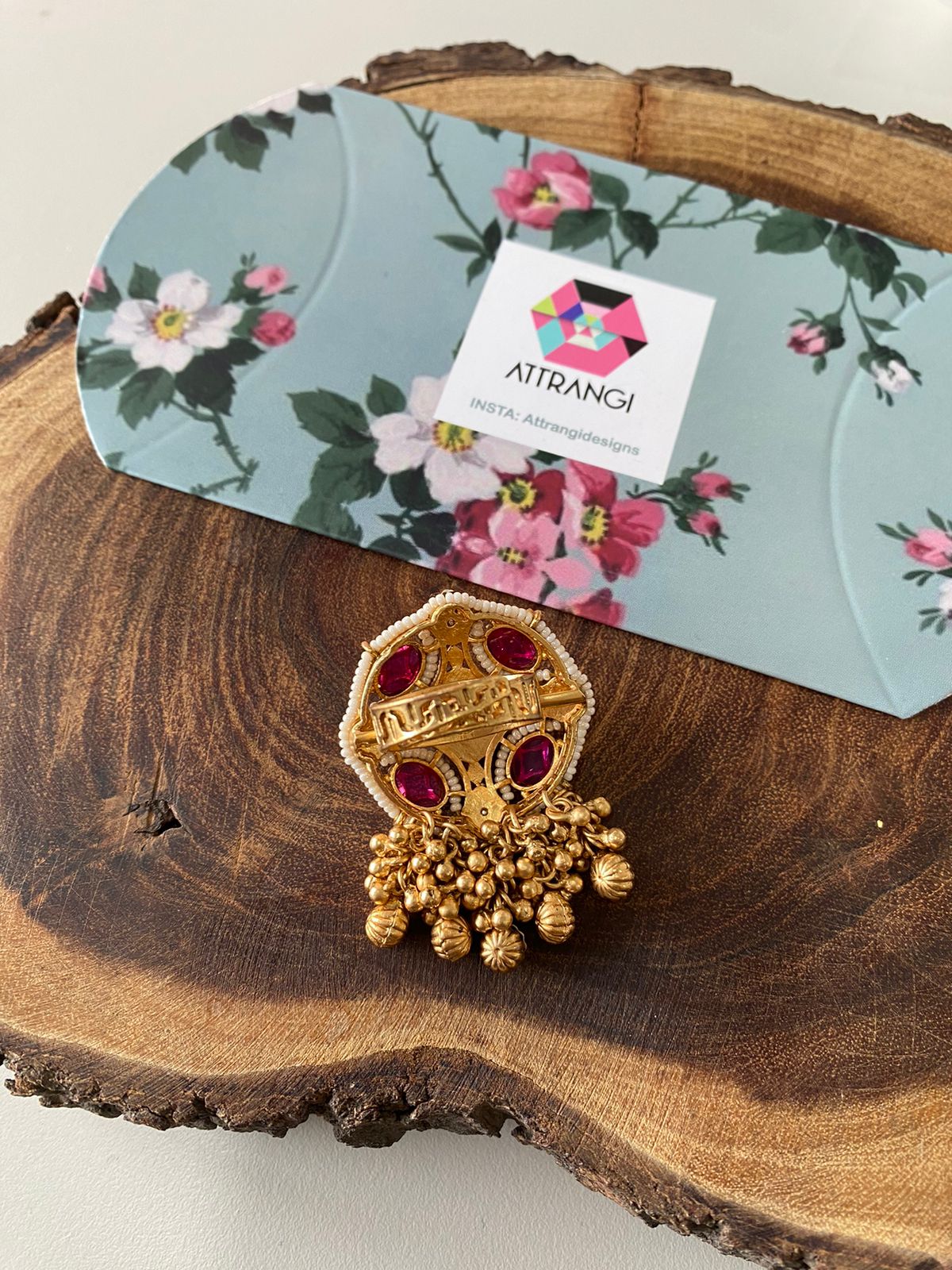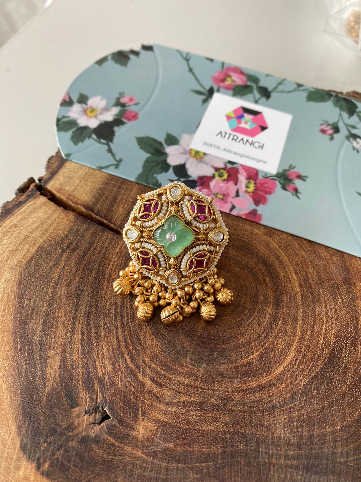 A big gold ring with a kharbuja mint bead in the Center and ghungroos of gold at the bottom. This traditional beauty outshines all designs with its sass and quirkiness, maintaining its traditional charm.