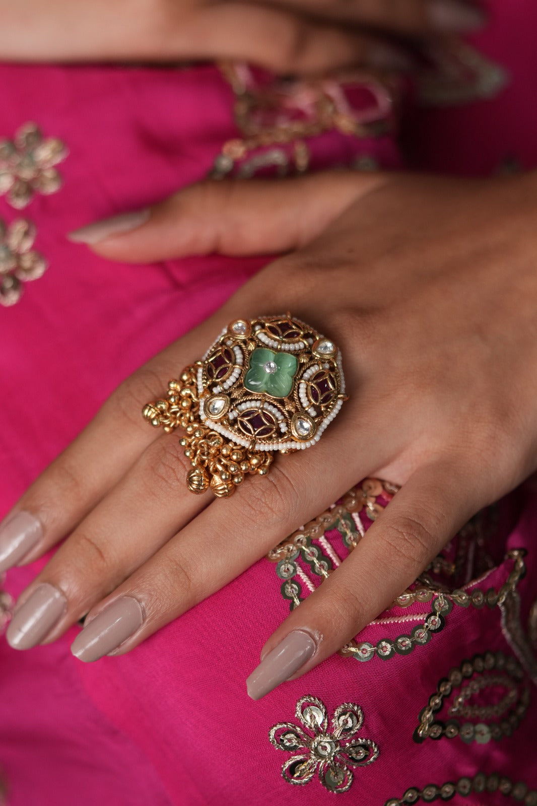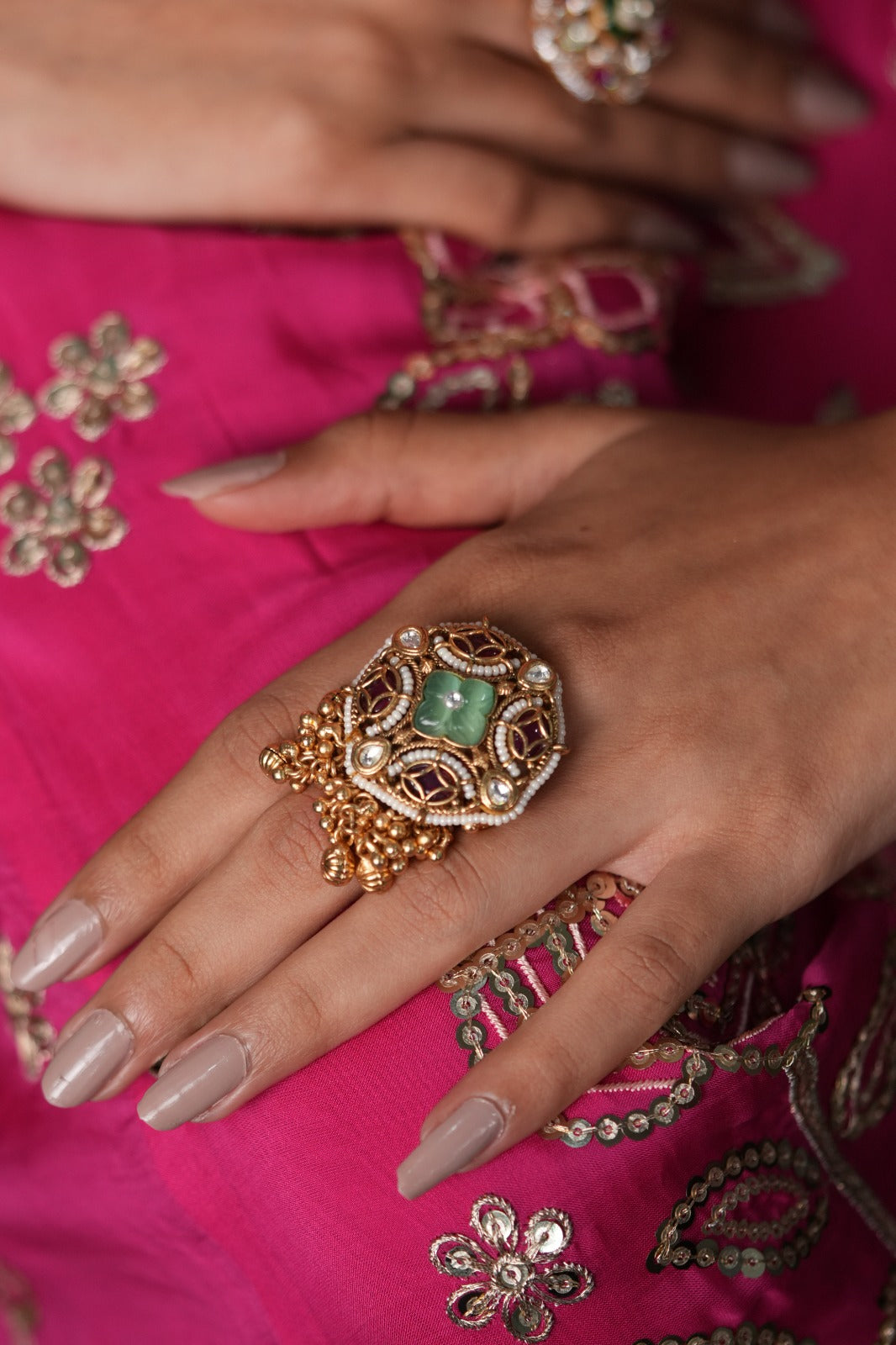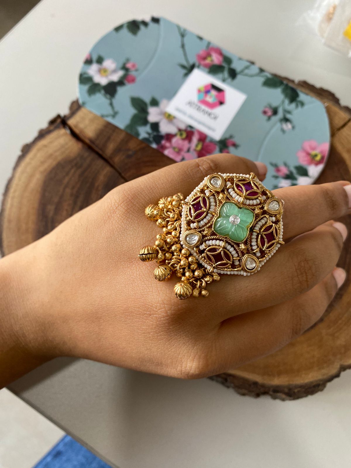 A big gold ring with a kharbuja mint bead in the Center and ghungroos of gold at the bottom. This traditional beauty outshines all designs with its sass and quirkiness, maintaining its traditional charm.