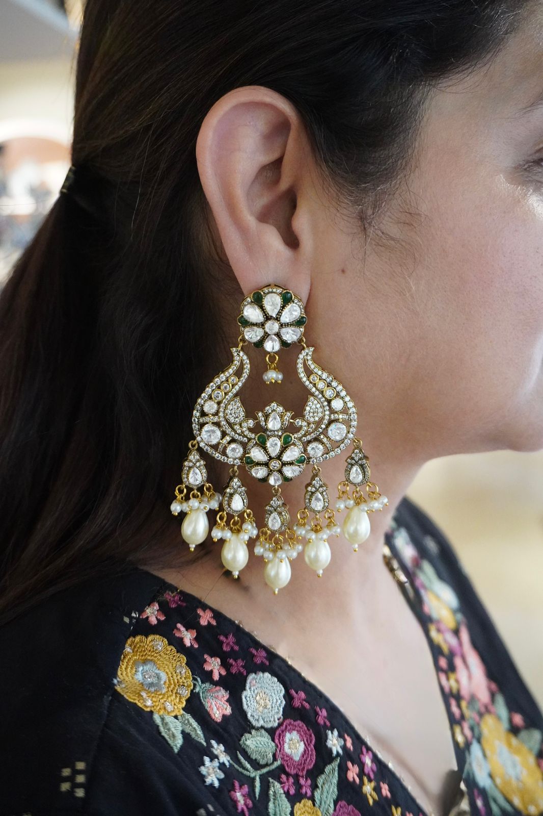 If you are looking for a Polki Chandbali that’s huge and big and in Victorian polish, then choose Amravali, with intense pearl play at the bottom, it never fails to look glamorous.