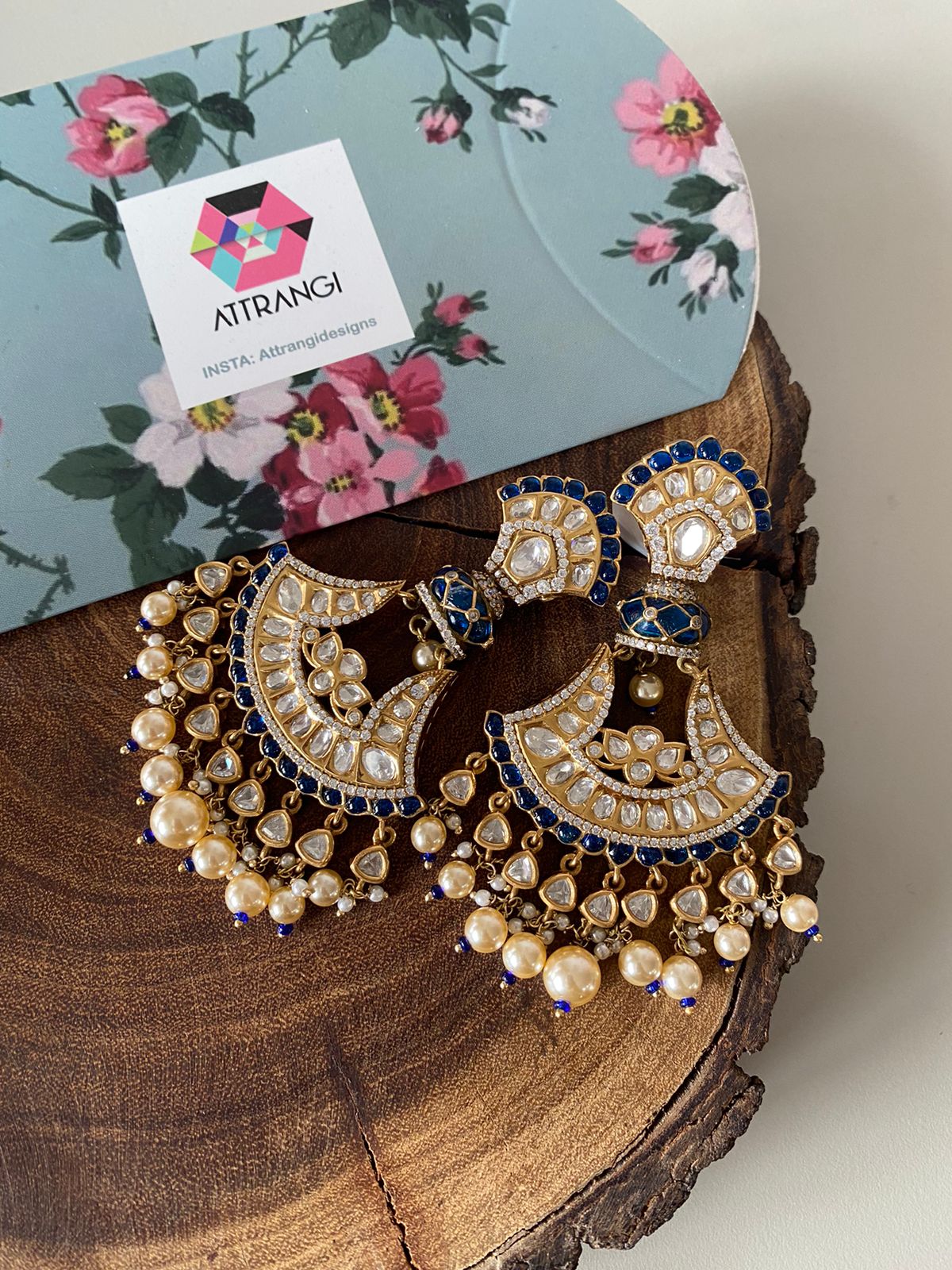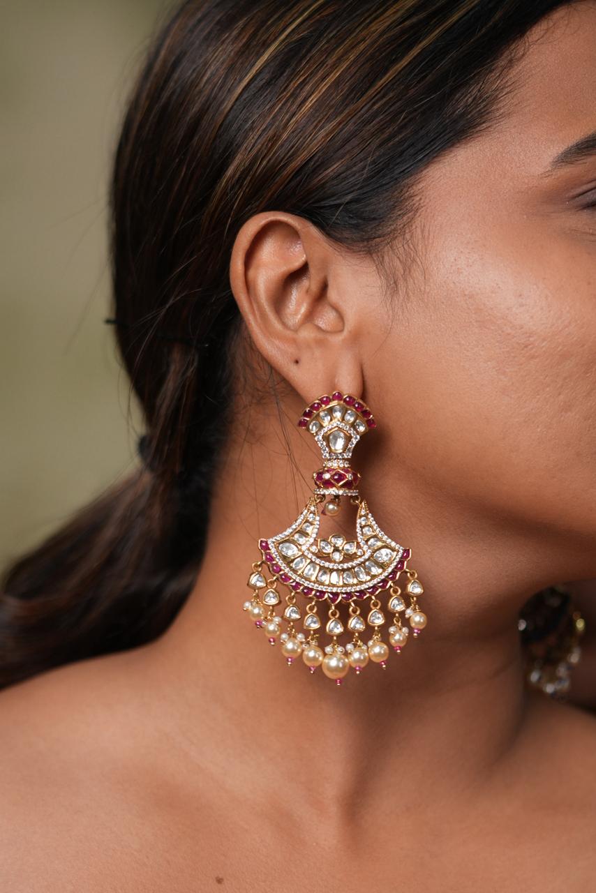 An Indian earring that has an off-beat Chandbali shaped design with pearls at the bottom and rich craftmanship. This evergreen Indian earring blossoms with great design and is an effortless statement maker.