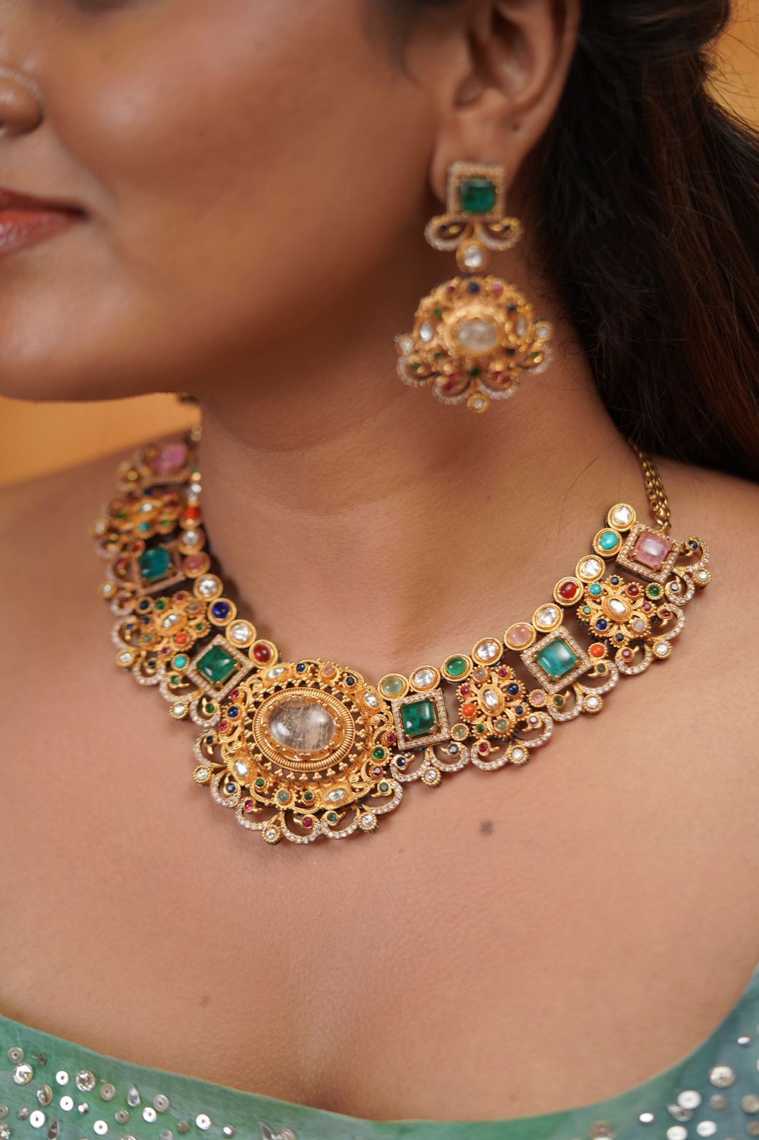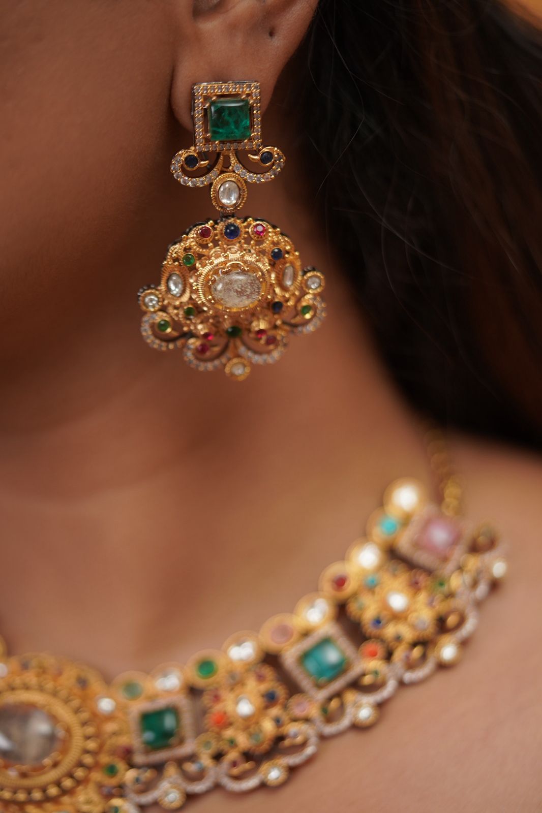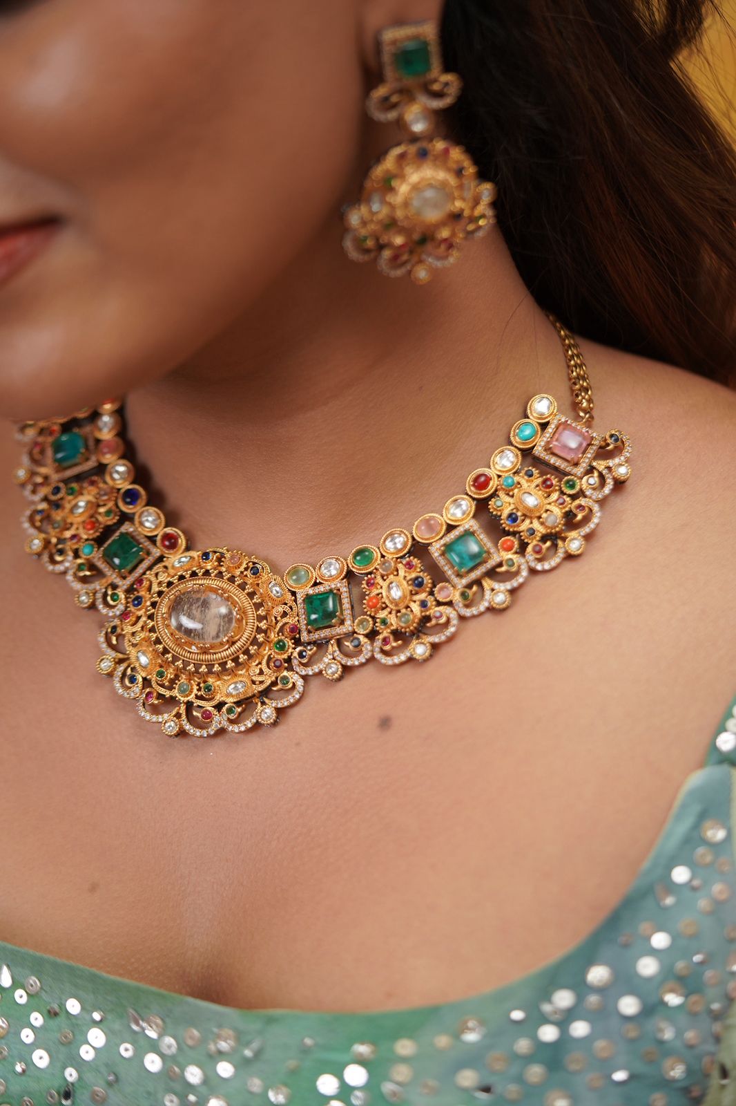 A contemporary touch to a traditional design. We bring to you the Bestseller from our Sabhya series. With navratna stones and precious gemstones this set  is no less than a piece of art. Crafted by the finest karigar for the most royal look. Who knew, multicoloured could look this good?