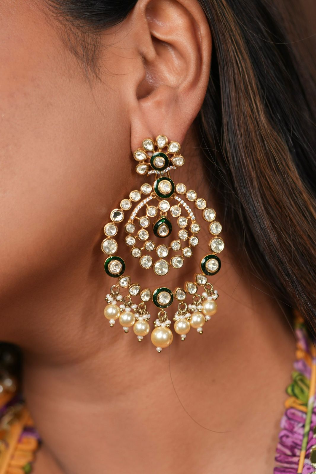 A Chandbali that has the classic Indian earring design with a more contemporary touch. It has minute enamel Meenakari detailing and a great pearl play at the bottom. It comes in a size, you can’t refuse
