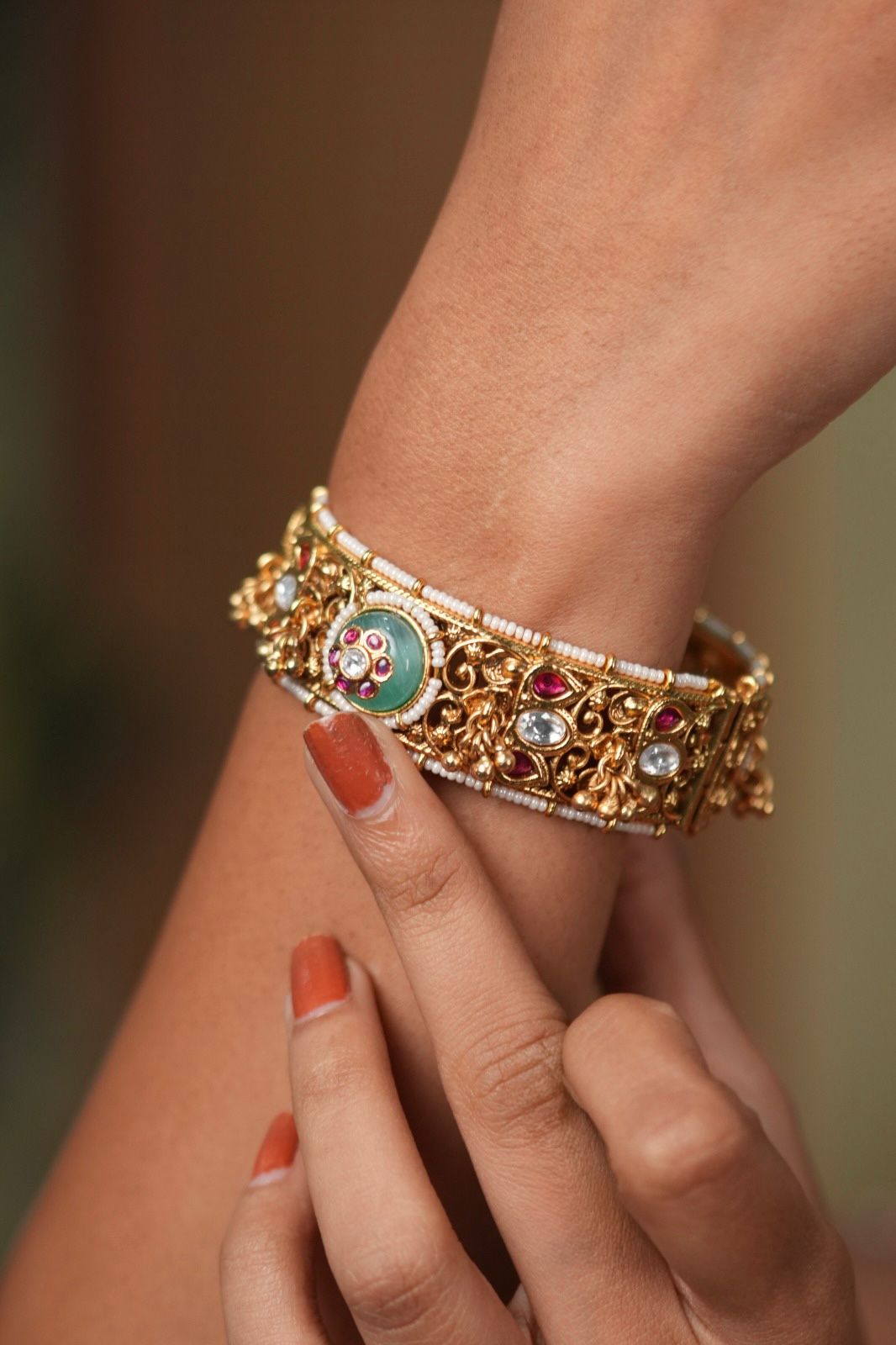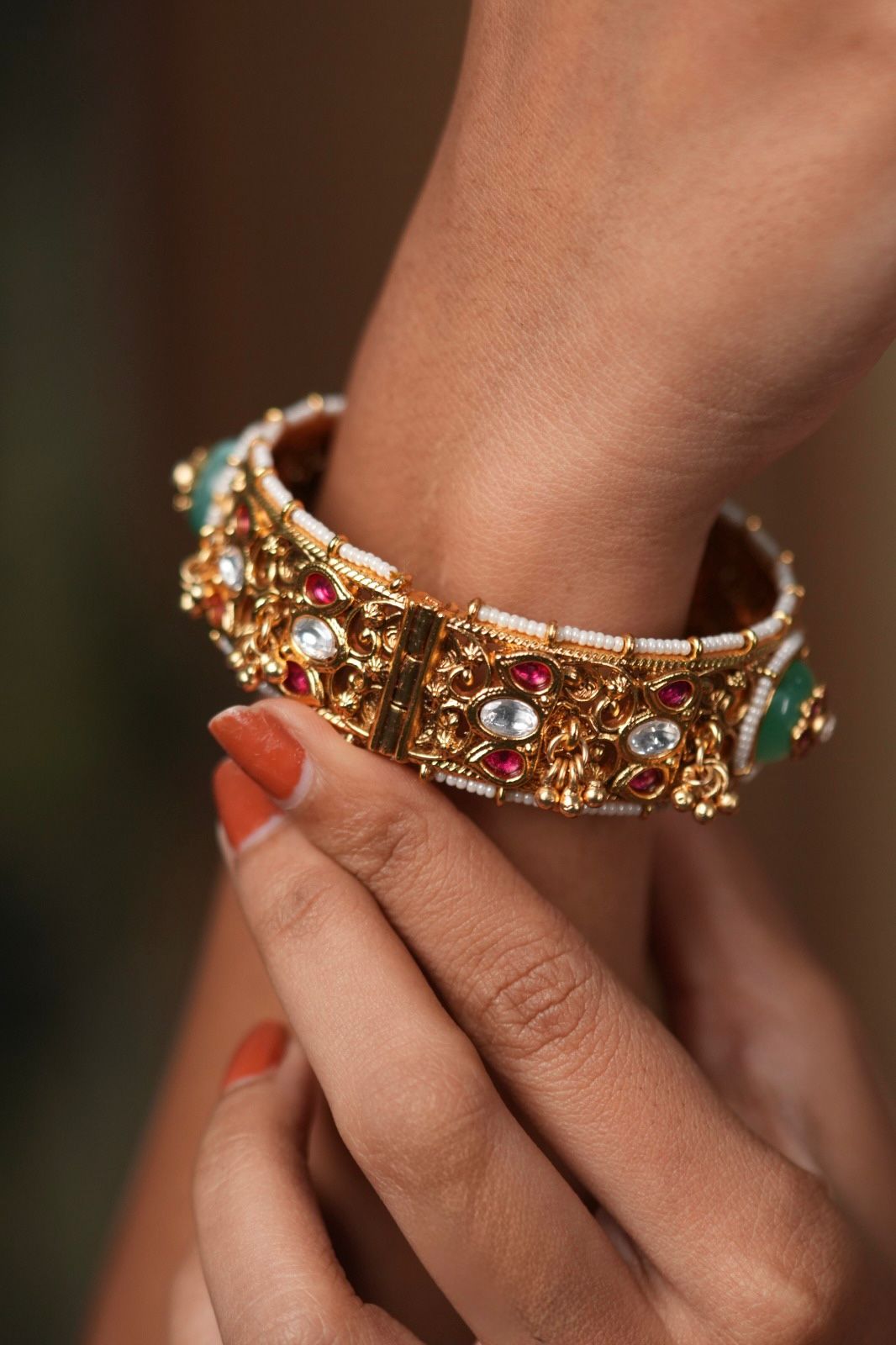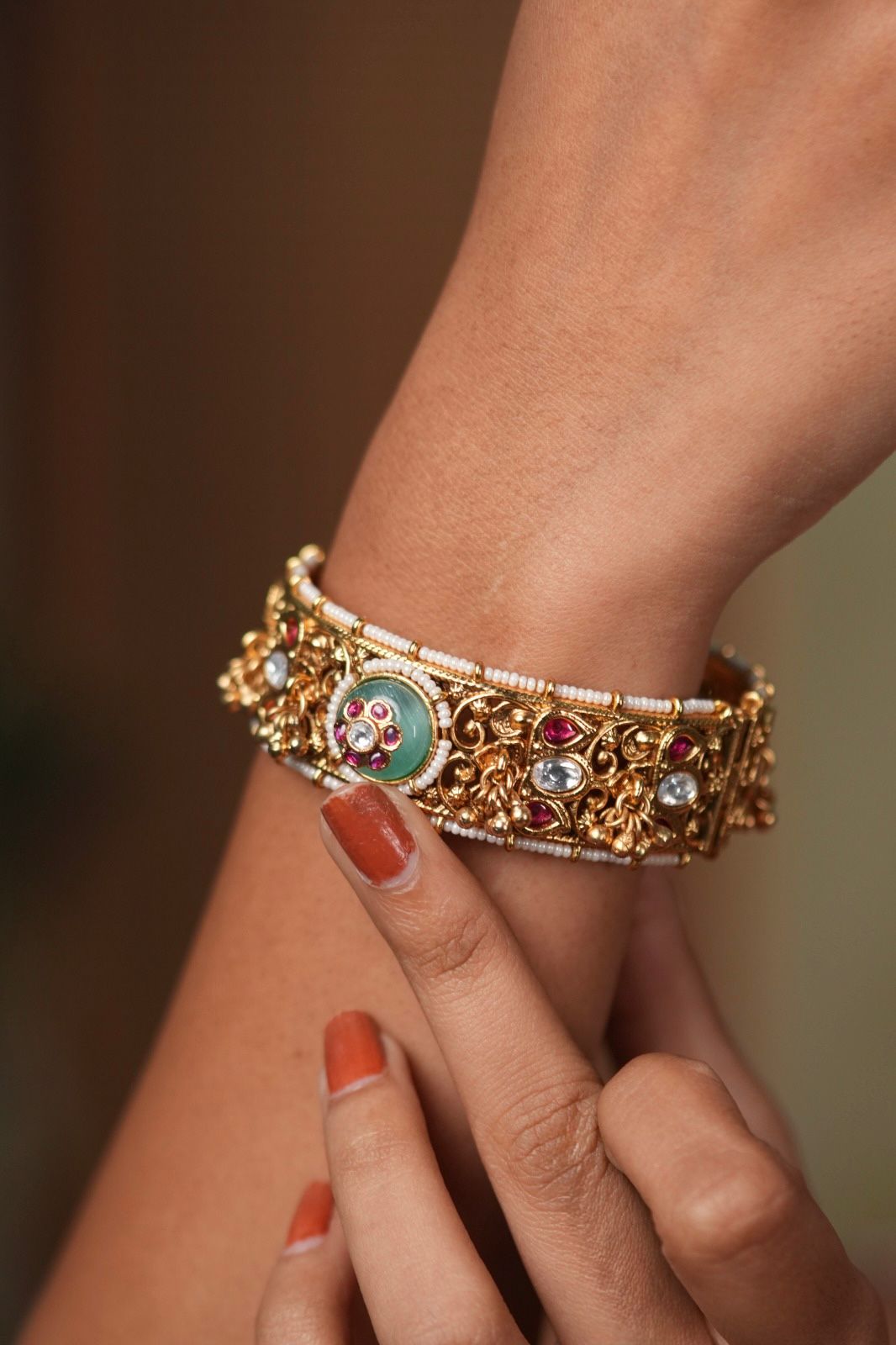 Ghungroos emerging out of the most classic and pretty intricate bangle with a kharbuja mint bead that has holdali work crafted on top.