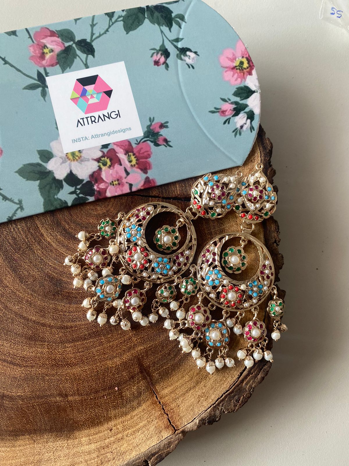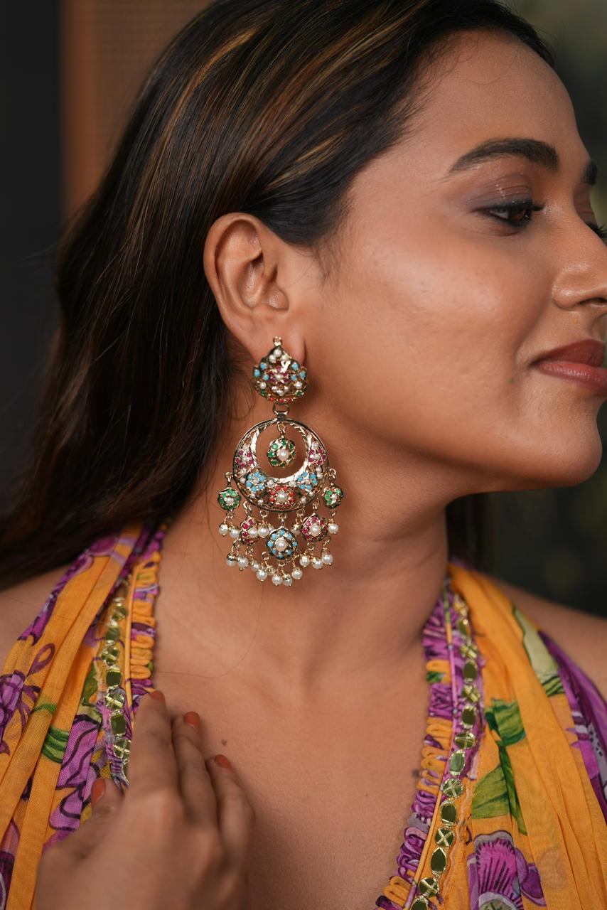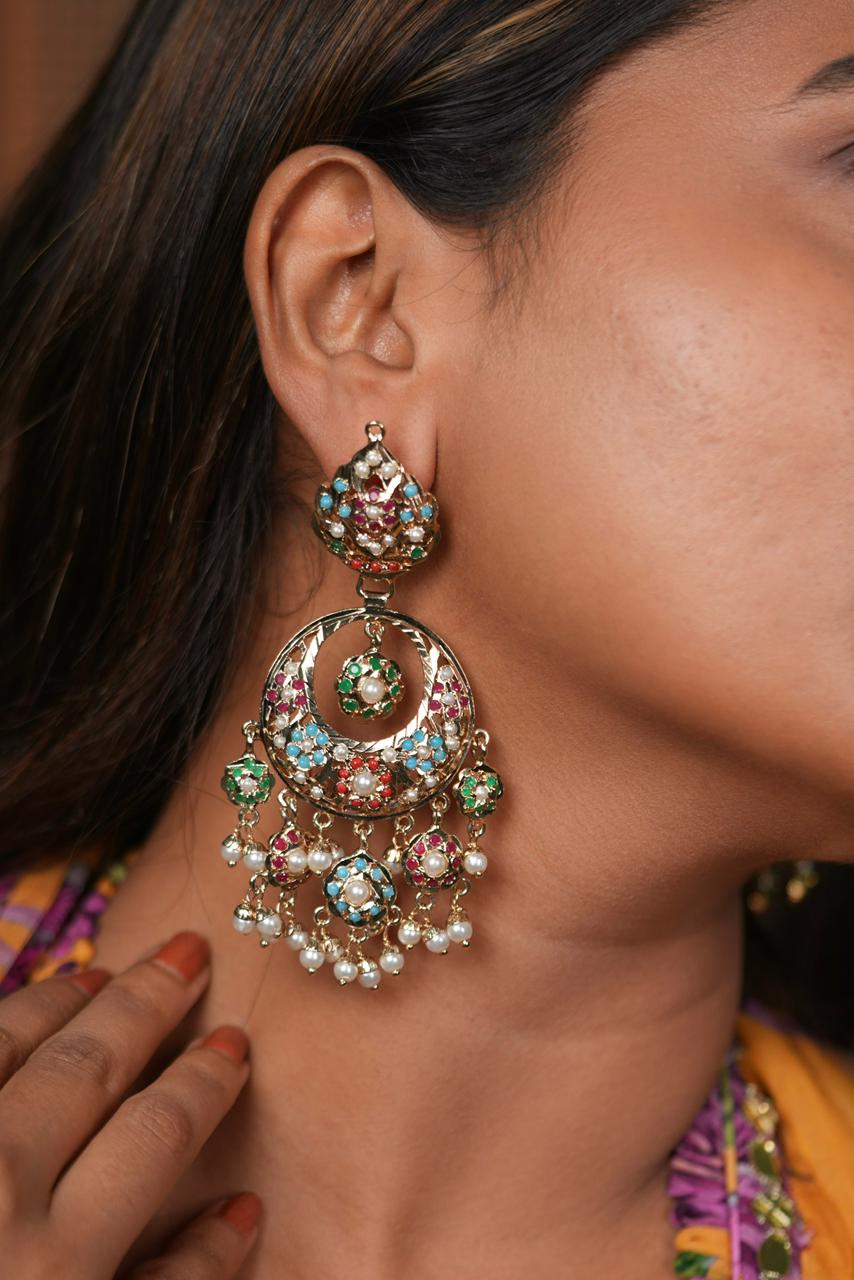 A Jadaau Chandbali earring with floral motif drops, pearl latkans at the bottom and the most detailed craftsmanship. This ultimate earring will be your favourite for everything desi.