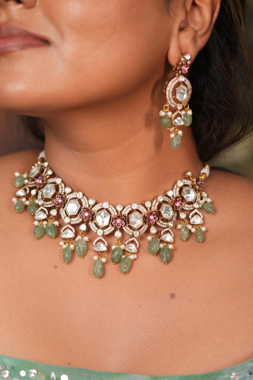 A stunning dull gold choker set with polkis and pumpkin beads and potta rubies. Heavy and pretty this one, is a star choker set that is remarkably gorgeous.