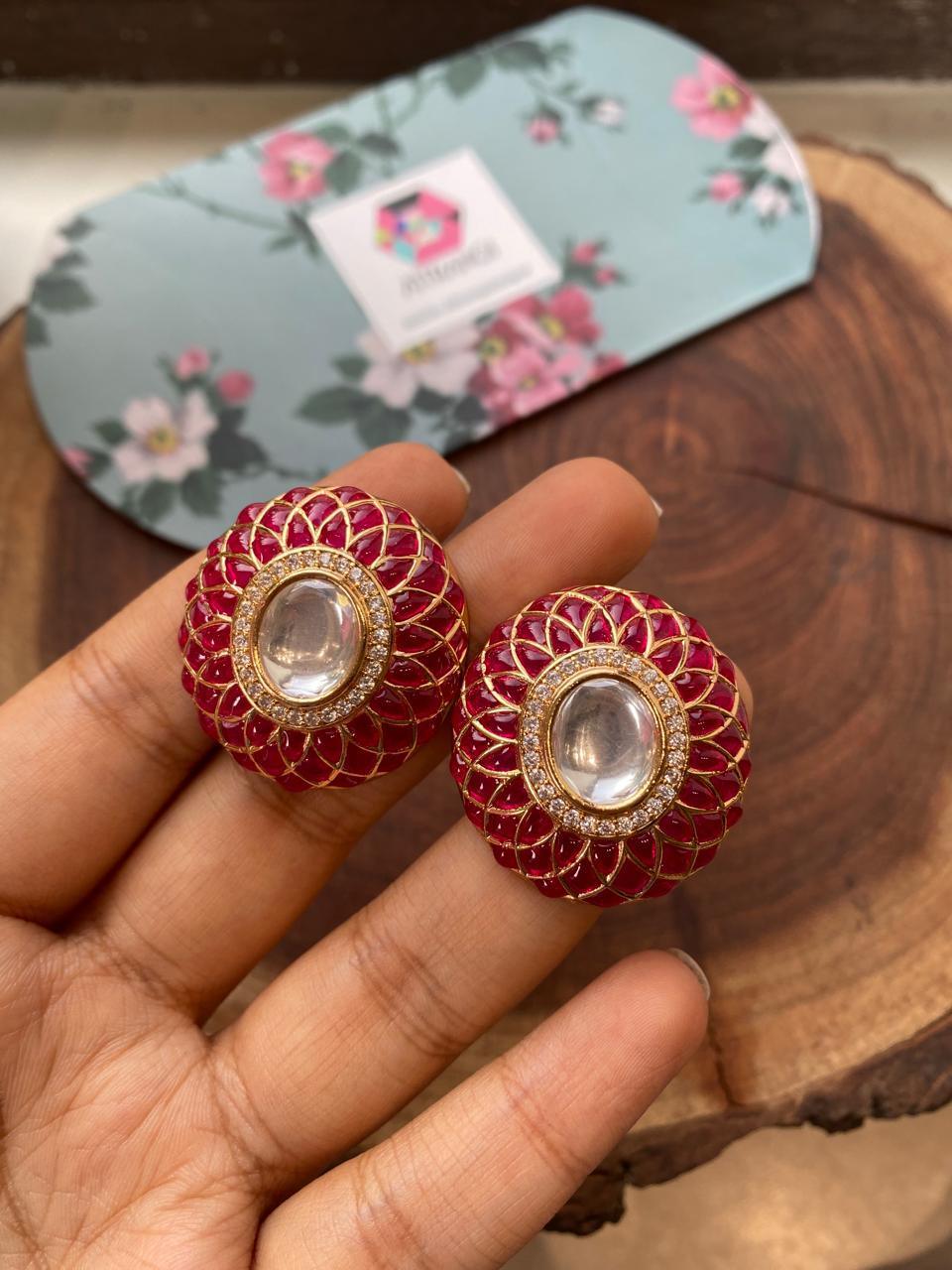 Indian studs, embellished with polki and minute diamonds in a floral motif with gold polish, ideal for elevating your simple temple look to the next level effortlessly!