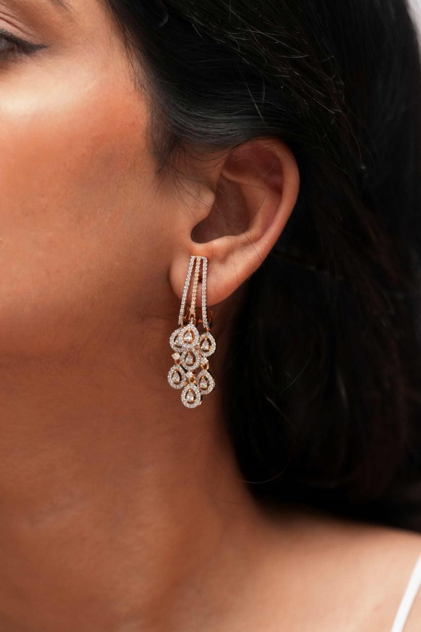 A long diamond earrings featuring a three-claw stud adorned with round diamonds followed by diamond hangings, resembling grapes, exudes timeless beauty that captivates effortlessly!