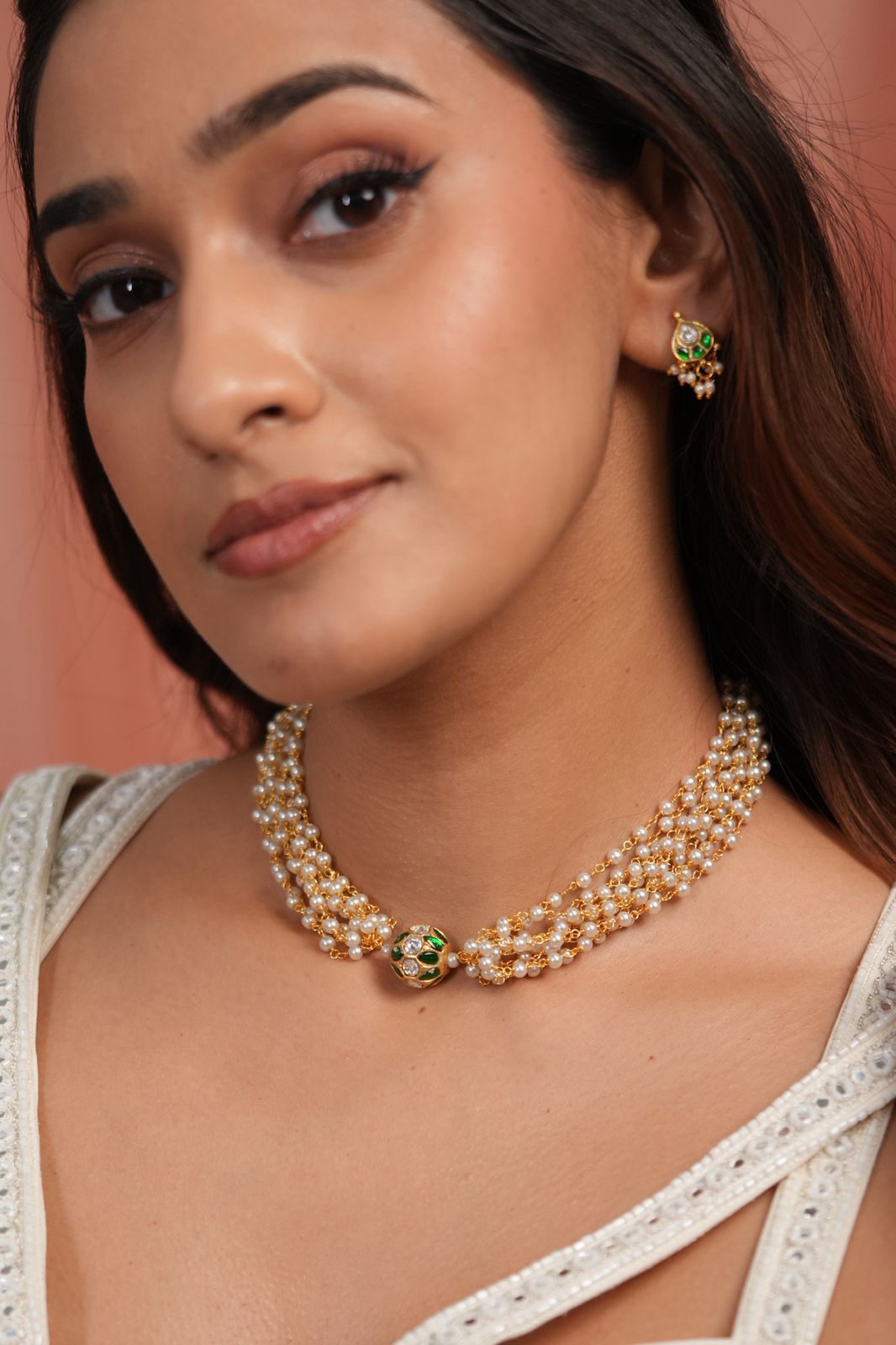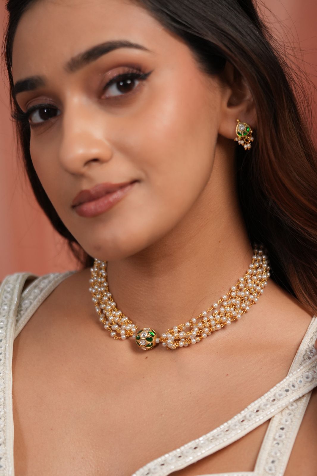 A gorgeous dainty Indo western design with just clustered pearls leading to a round Polki emerald motif. This set comes with the tiniest and cutest earrings that make this, so versatile and wearable