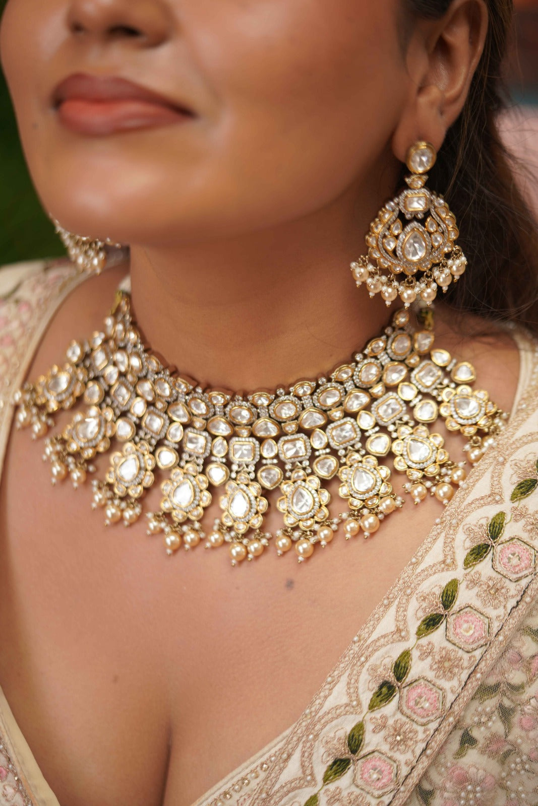 A well sized bridal choker set in moissanites that you just cant go wrong with. With uncut diamonds that shine bright, this one is not too grand, not too simple either. Opt for this, if you want to play it safe and keep it classic.