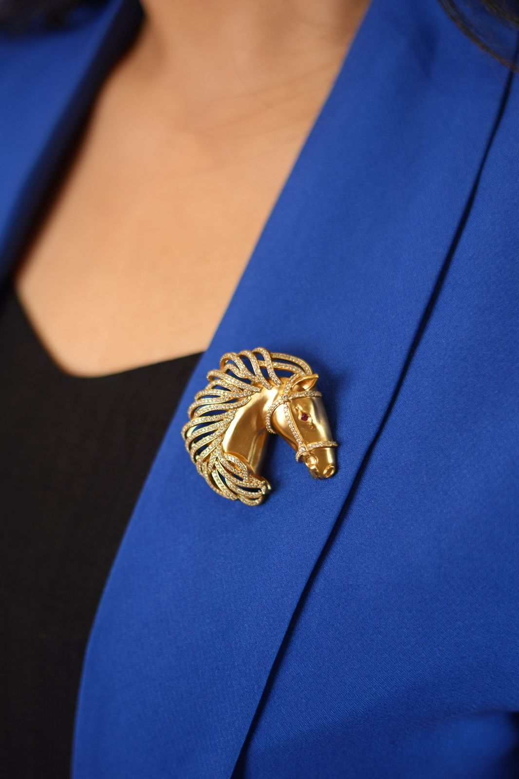 A regal derby horse brooch crafted in gold with sparkling diamond accents, symbolizing power, grace, and timeless style.