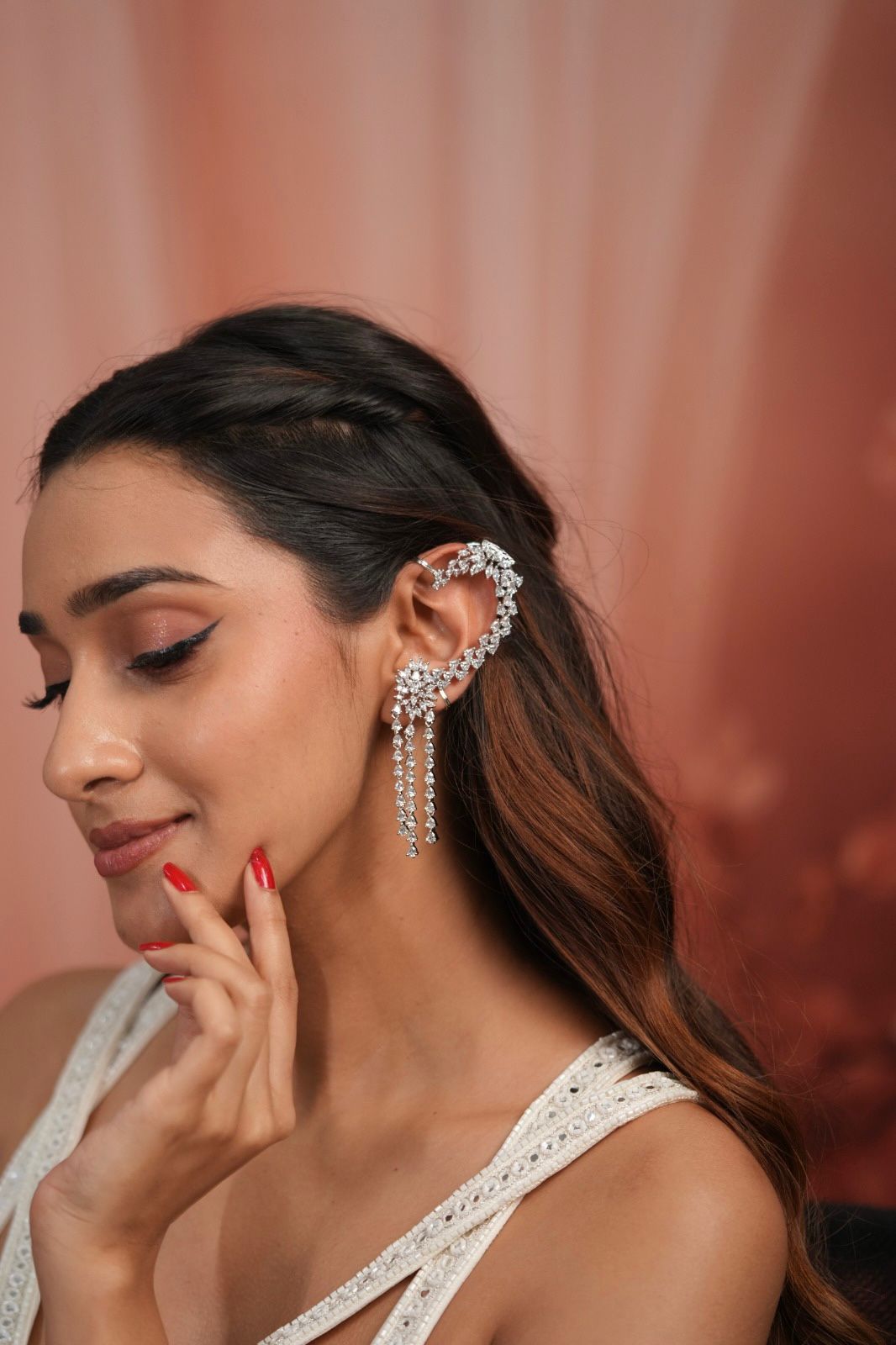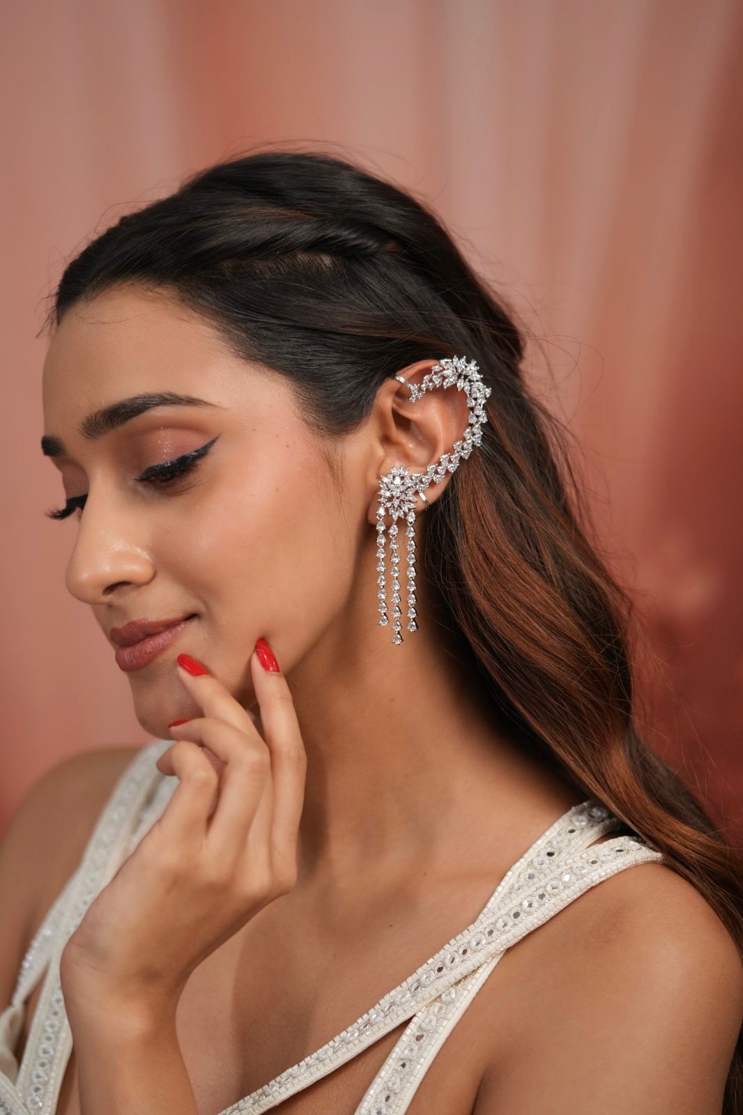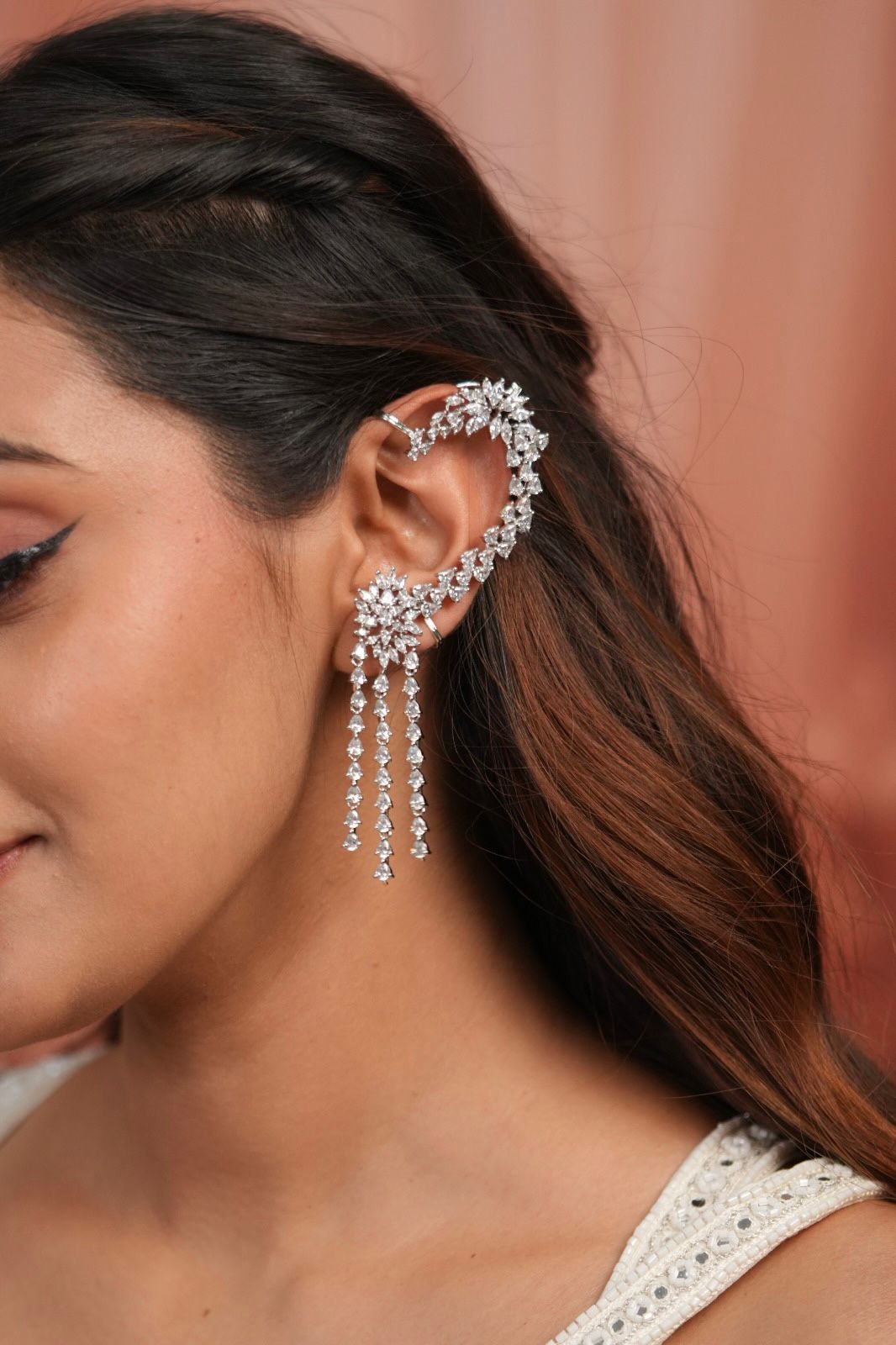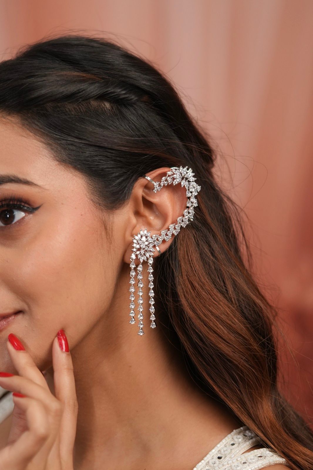 Long diamond earring danglers with a simple cuff design on top extending on your earlobe and looking radiant and gorgeous. The most iconic statement making huge diamond earcuff that you cannot say no to.