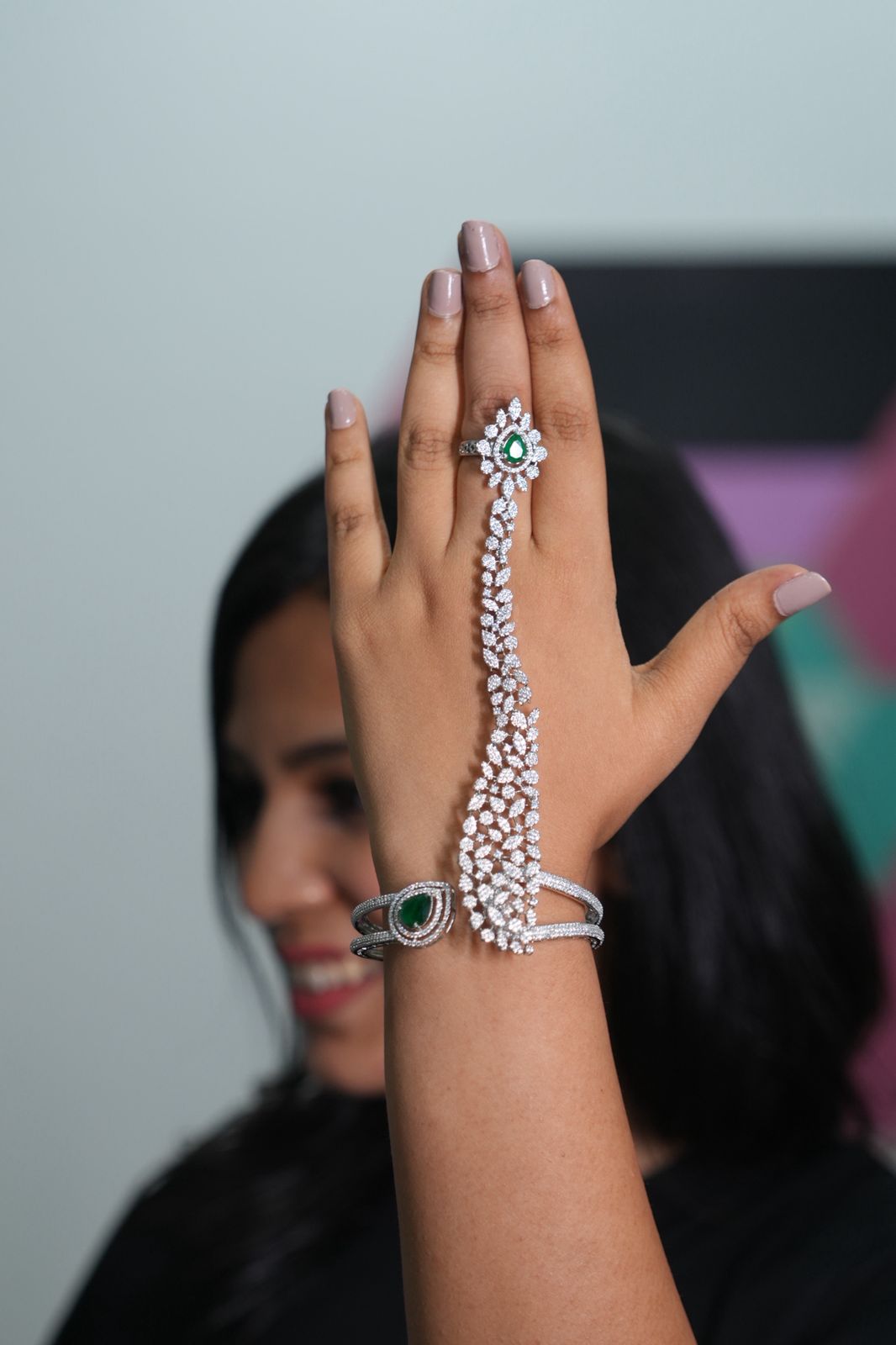 A gorgeous designer hand harness that opens and fits just like a bracelet but extends itself with minute diamond detailing all the way to the fingers leading To a coloured stones. This design completes and compliments any cocktail look.