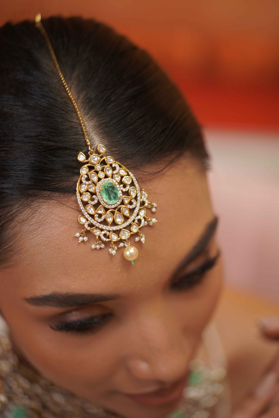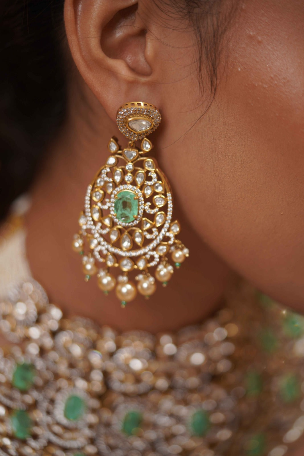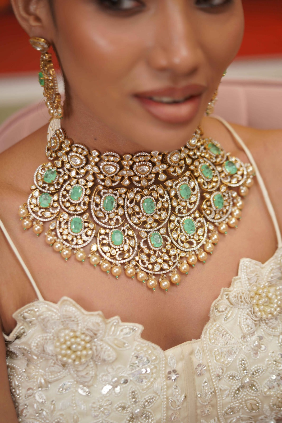 The most dramatic polki moissanite choker set that has screams bridal feels. It comes with a matching maangtika. The next to real Russian emerald mint colour is the latest trend, don't miss it!