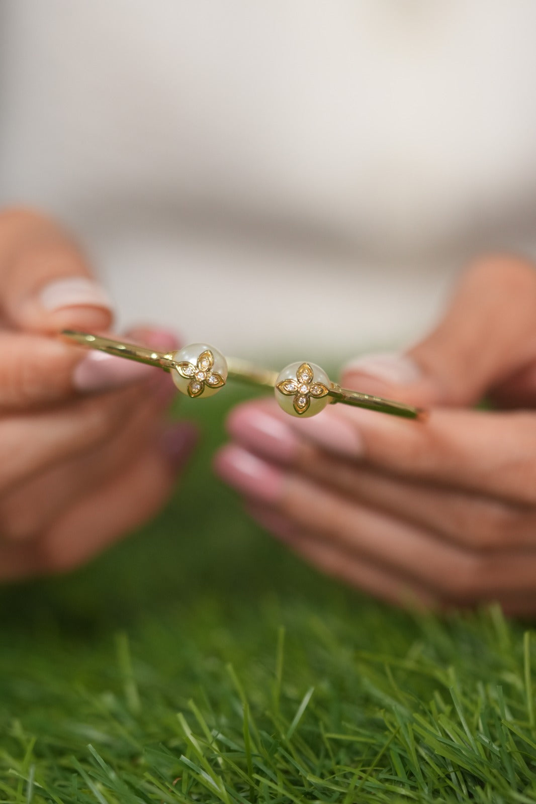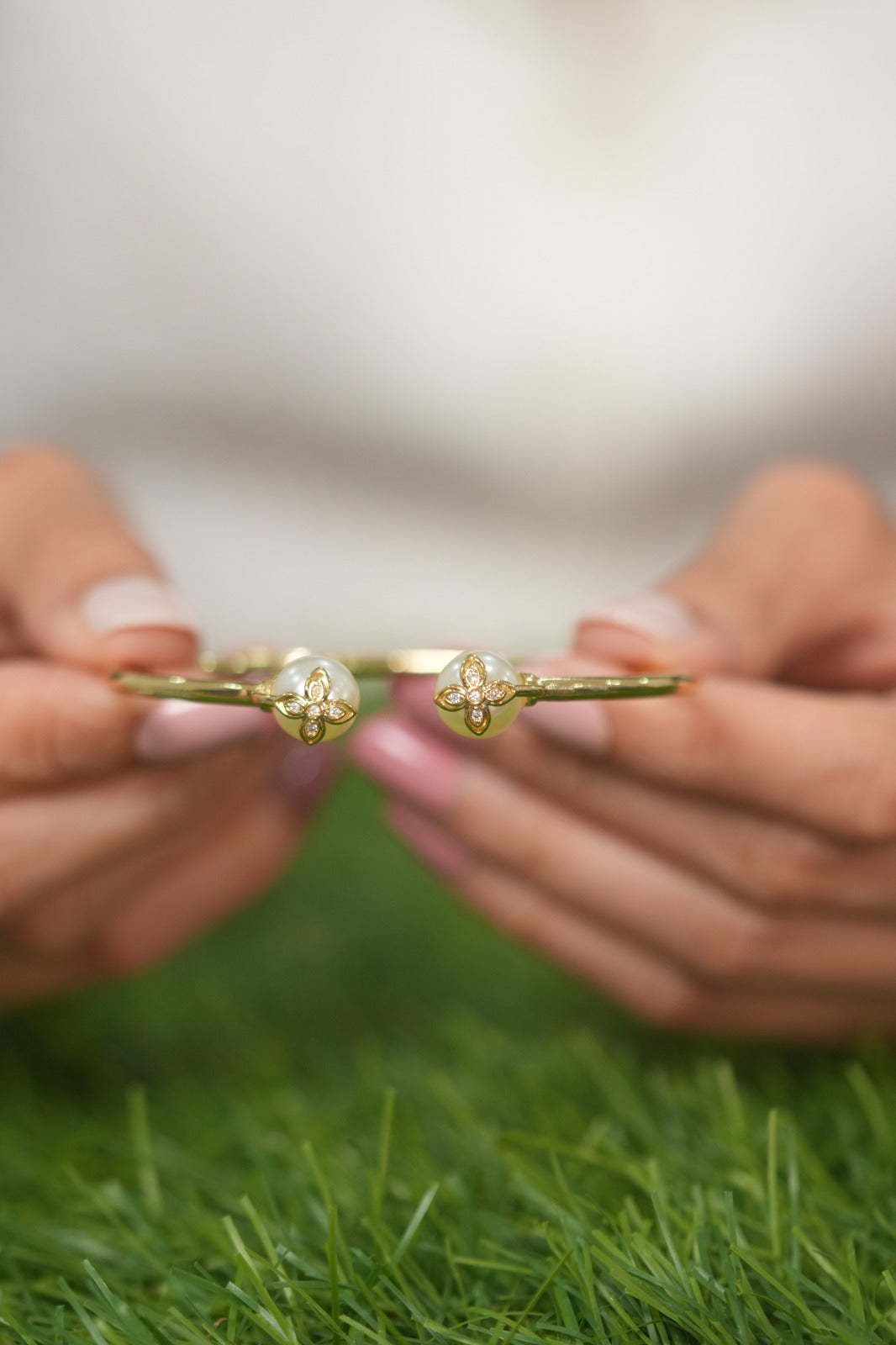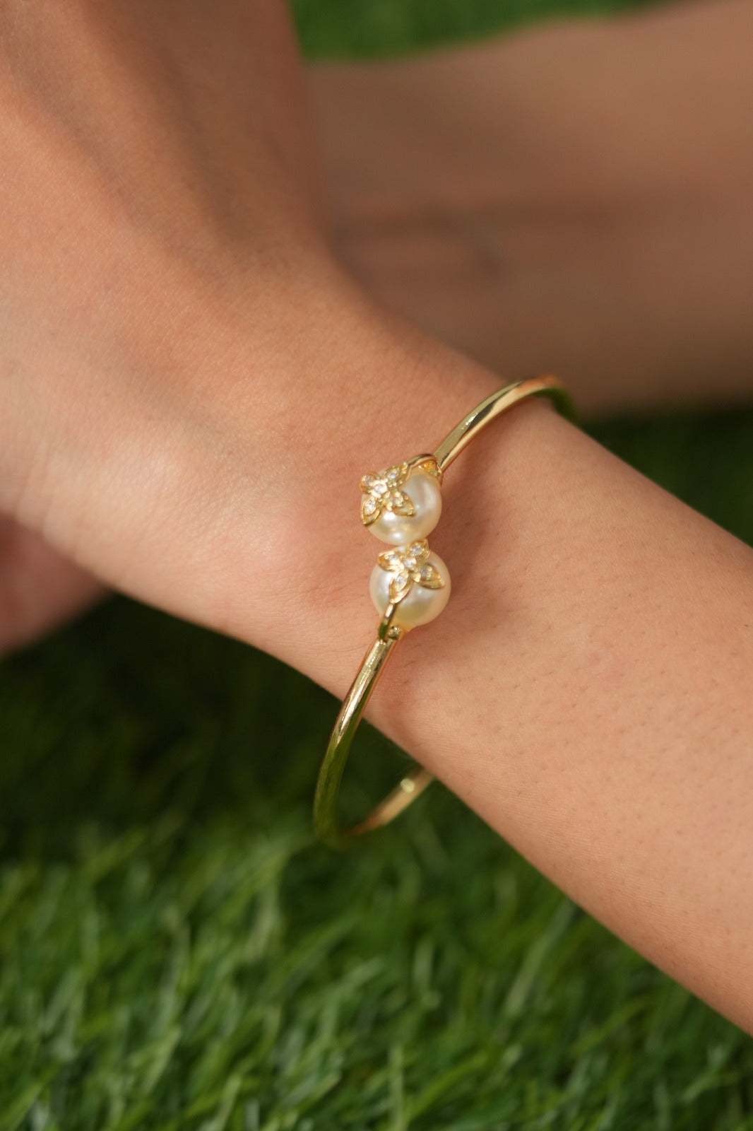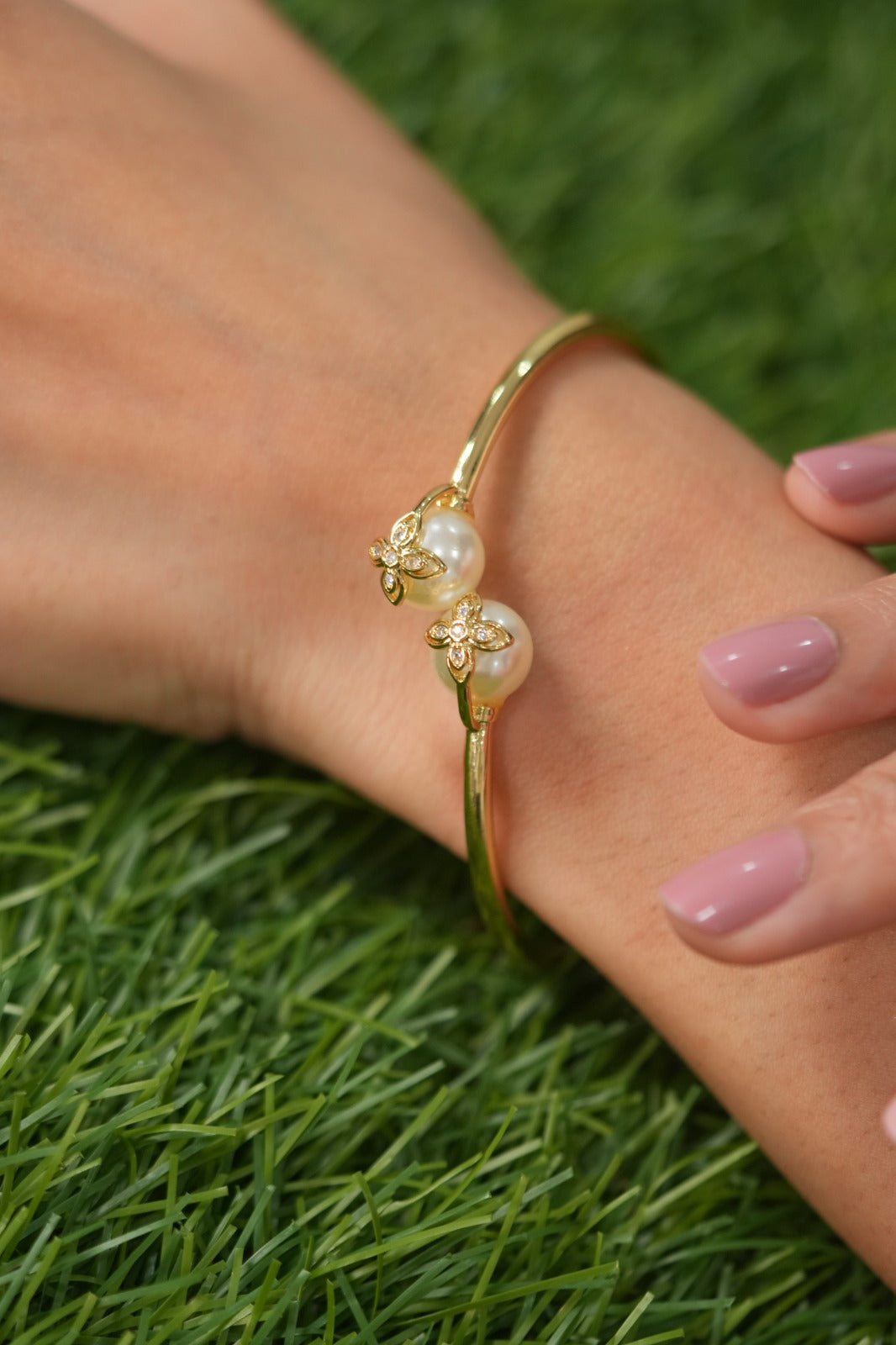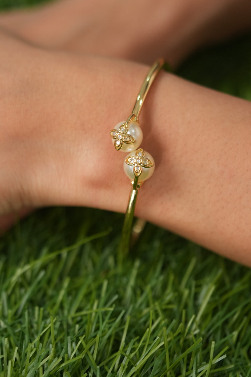 Floral Diamond On Pearl Western Party Wear Gold Twistable Bracelet