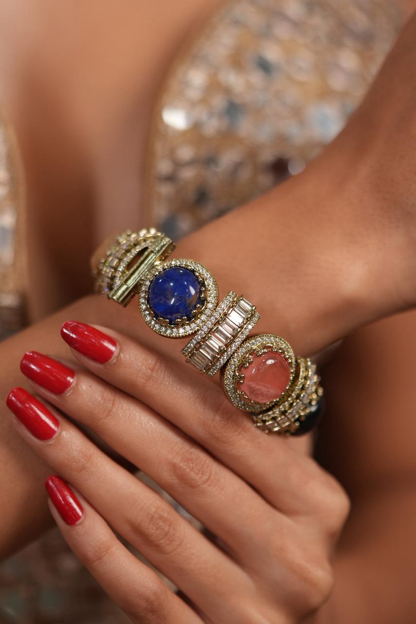 A colourful multi gemstone kada with baguette diamonds In a dull gold polish that has the gleam to make you stand out. One solid kada to last you a life time & to match everything you own.