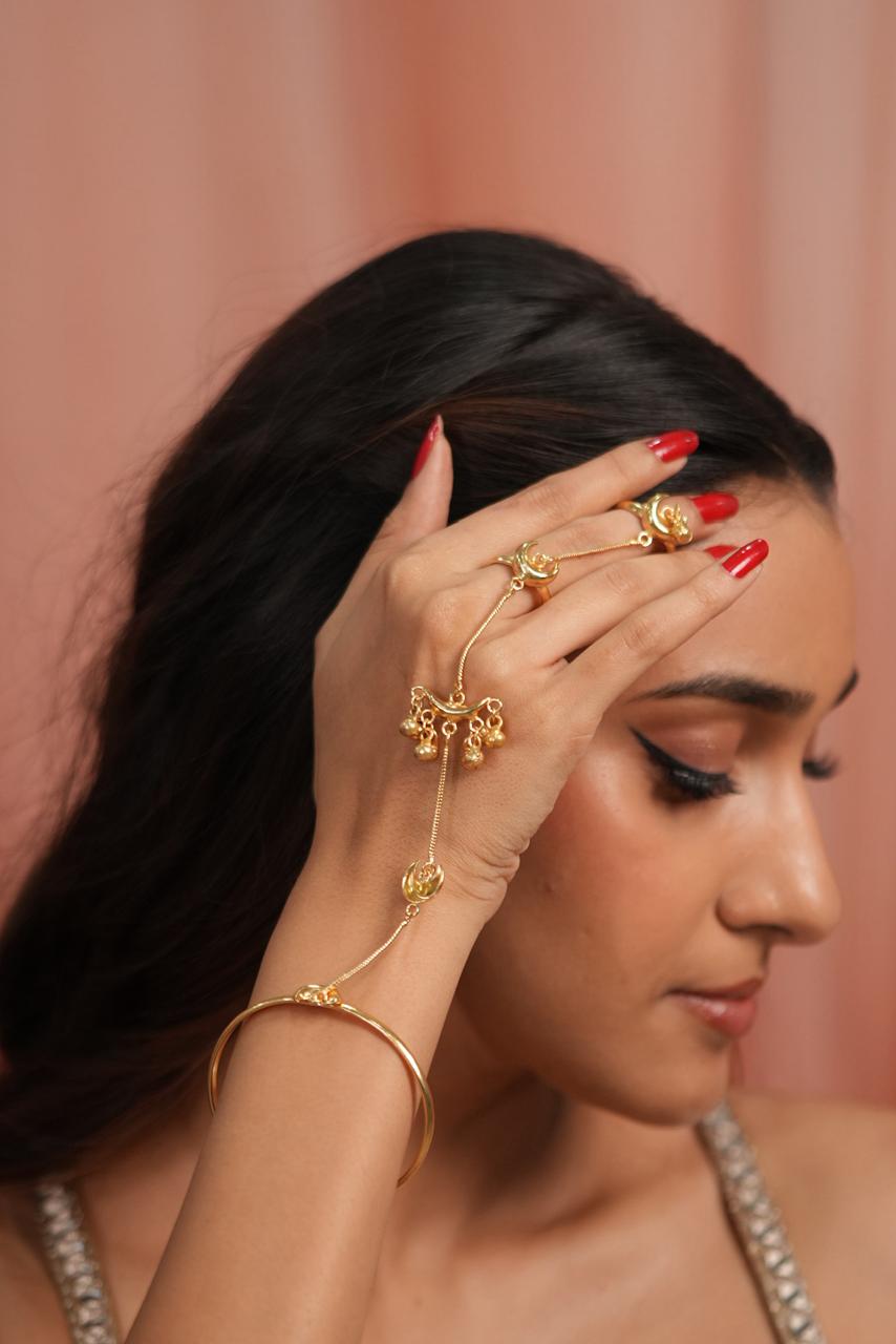 A pretty hand harness extending with delicate gold craftsmanship all the way to your fingers for a desi urban glam.