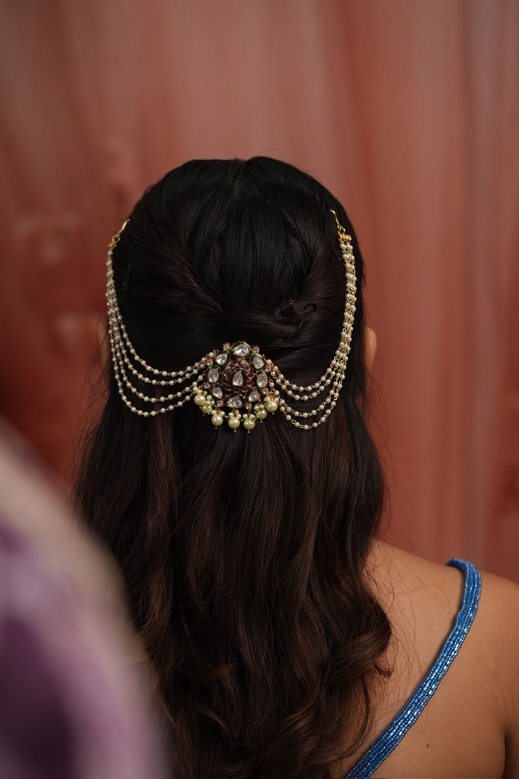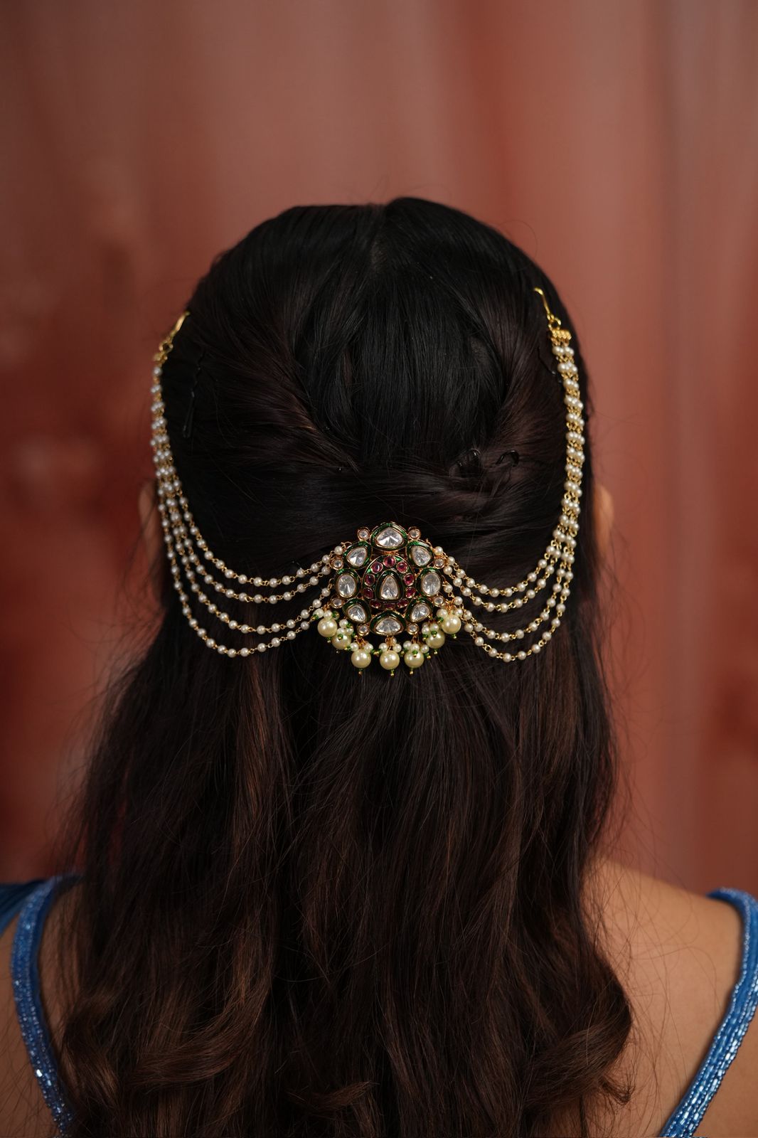 A gorgeous Hairchain with 4 layers of pearls attached to an uncut diamond centerpiece that has pearls at the bottom and Meenakari detailing.
