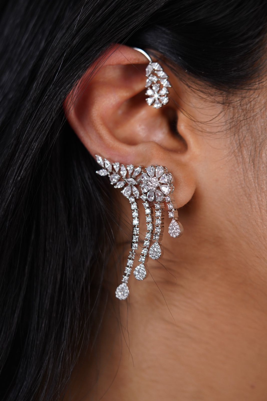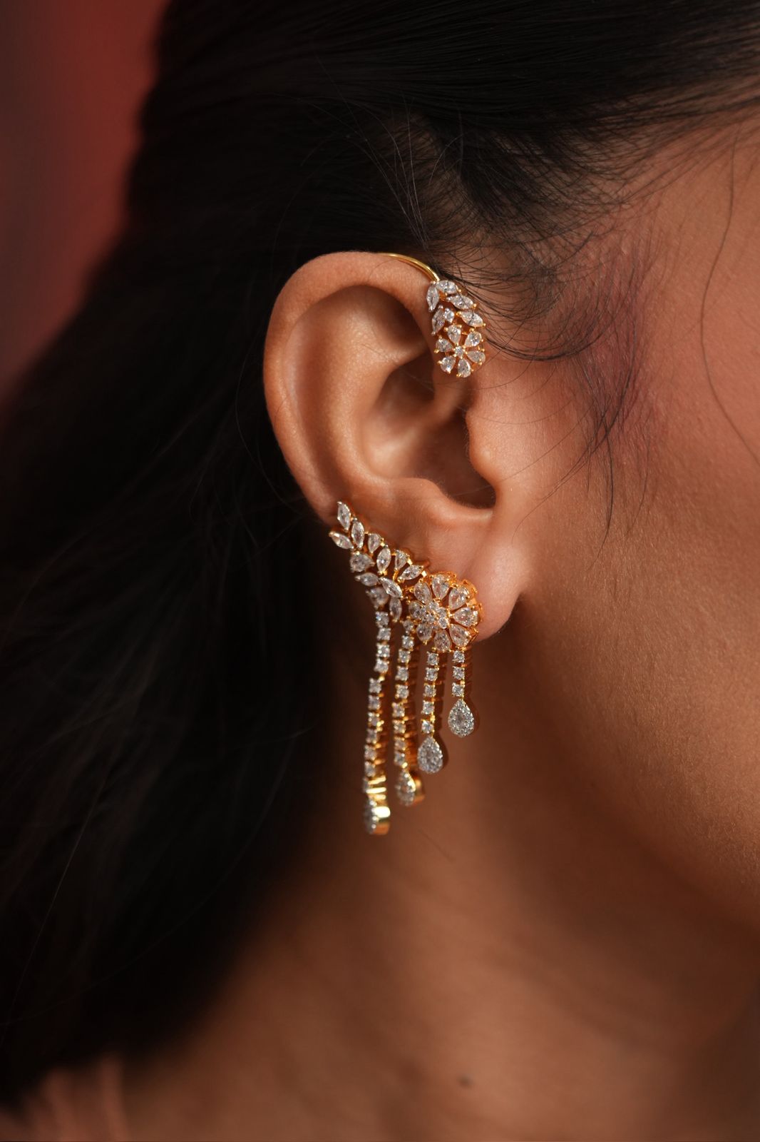 Diamond ear cuffs featuring four graduating diamond lines that cascade elegantly into pear-shaped solitaires. Finished with delicate floral motifs on top, crafted from marquise and pear-shaped stones