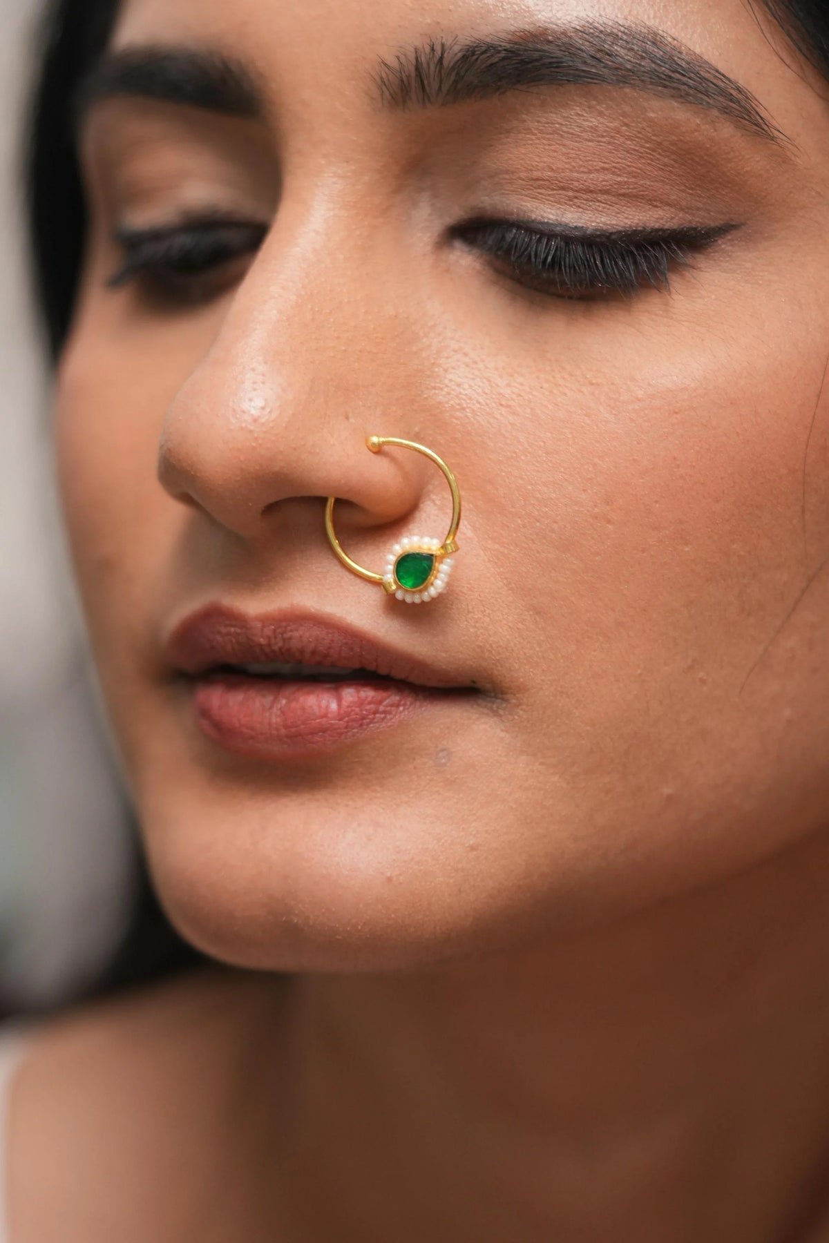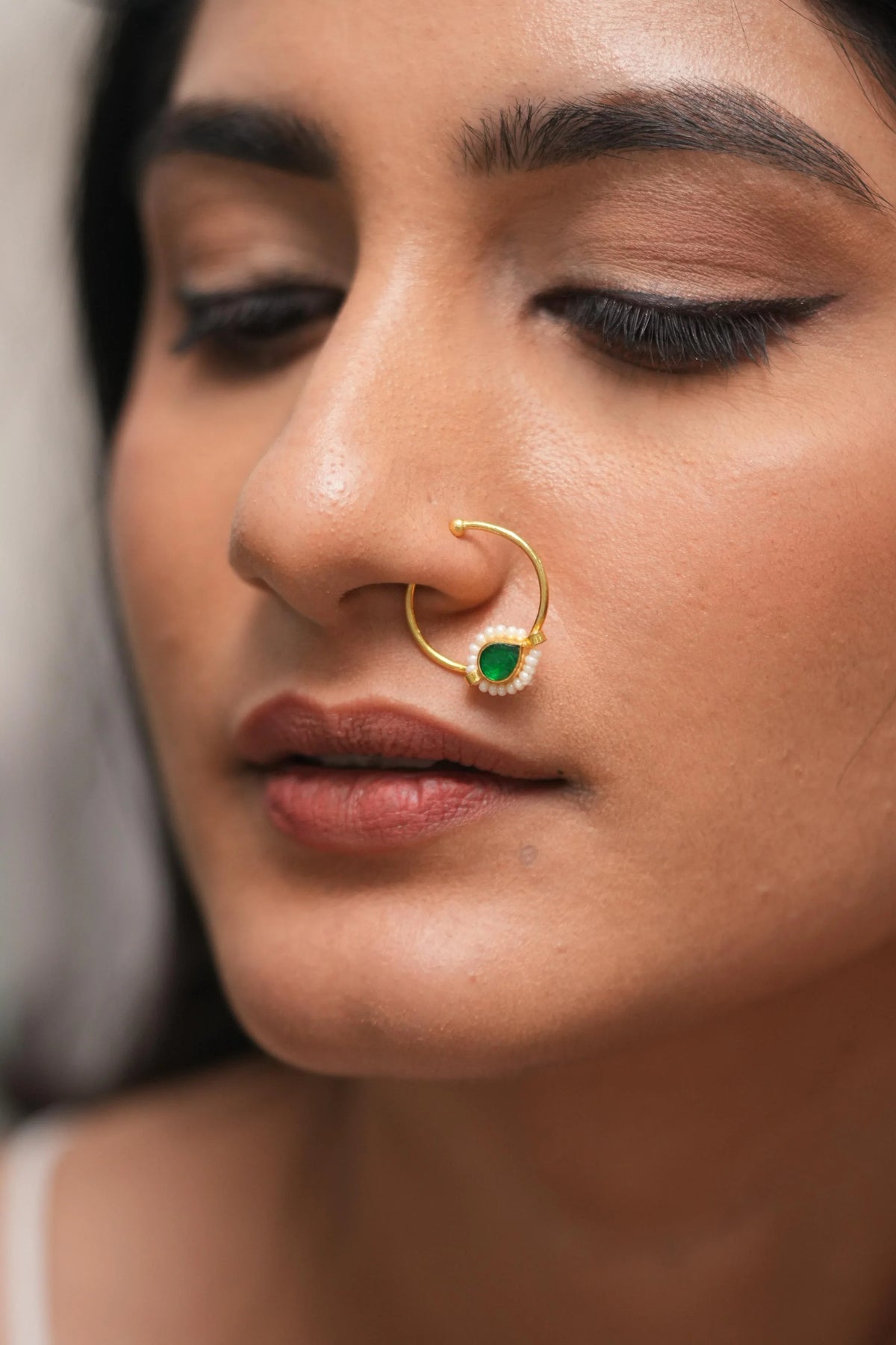 A graceful nod to timeless tradition, the Kavya Mini Gold Indian Nath features a delicate gold hoop adorned with a vibrant emerald green stone, encircled by fine pearl detailing. Designed for modern minimalism with a heritage touch, this nose ring is lightweight, easy to wear, and perfect for weddings, festivals, or intimate celebrations. A charming blend of elegance and simplicity, it beautifully complements both ethnic and Indo-western looks.